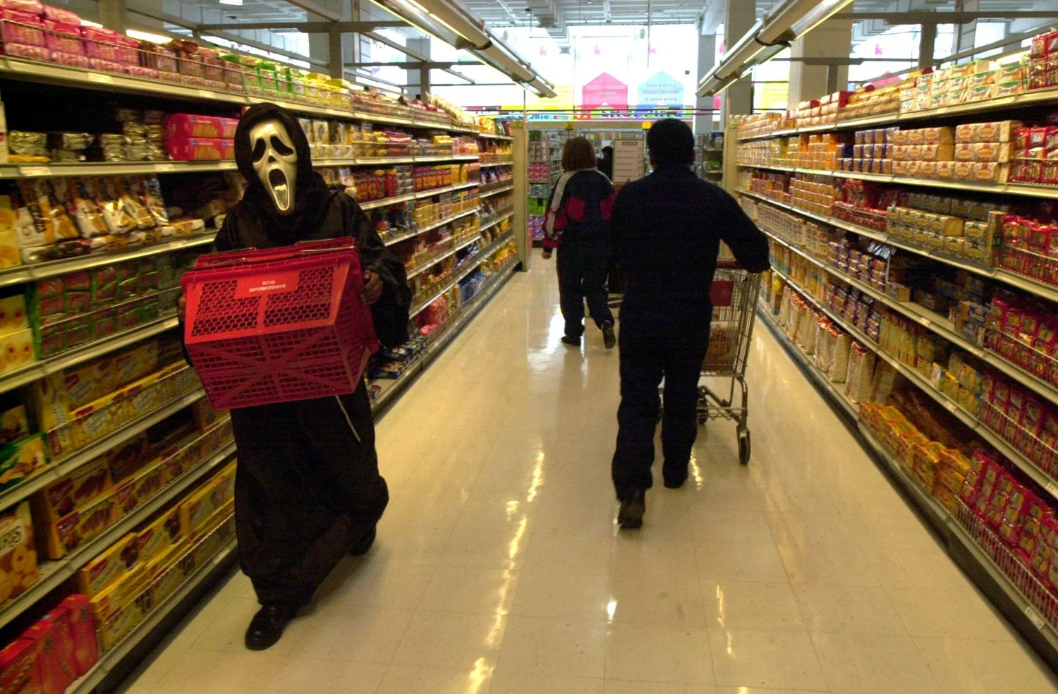 Alberto in his costume carries some shopping baskets in a supermarket, in La Paz, Bolivia, Thursday, Oct. 31, 2002. All employees in this supermarket are disguised in Halloween costumes one day ahead of All Saint's day. (AP Photo/Pablo Aneli)