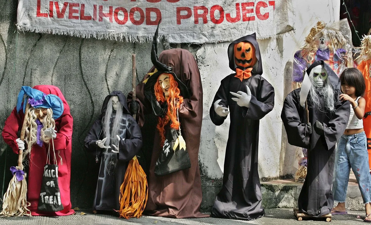 A Filipino girl arranges Halloween displays which are being sold from 500 to 1,000 pesos (about US$10 to $20) along a street in Manila, Philippines, Sunday, Oct. 30, 2005. The Philippines, a former U.S. colony, has adapted several American traditions, including Halloween. (AP Photo/Aaron Favila)