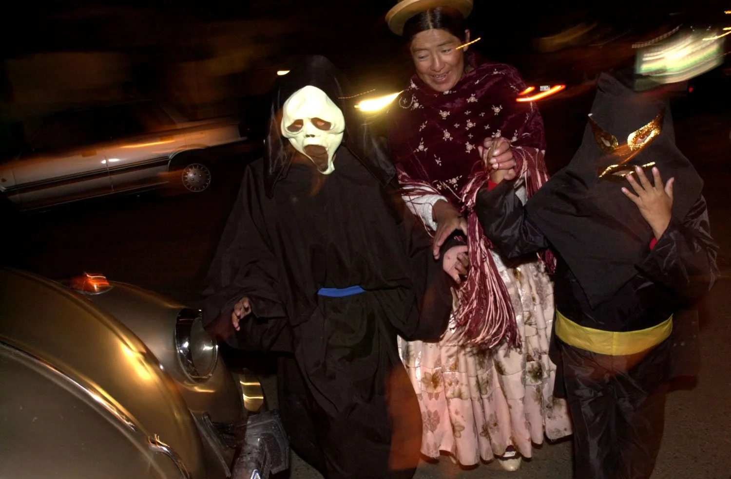 Two boys arrive at a Halloween celebration with their nanny in La Paz, Bolivia, Thursday, Oct. 31, 2002. In recent years, Halloween has become a popular tradition for the upper classes. (AP Photo/ Pablo Aneli)