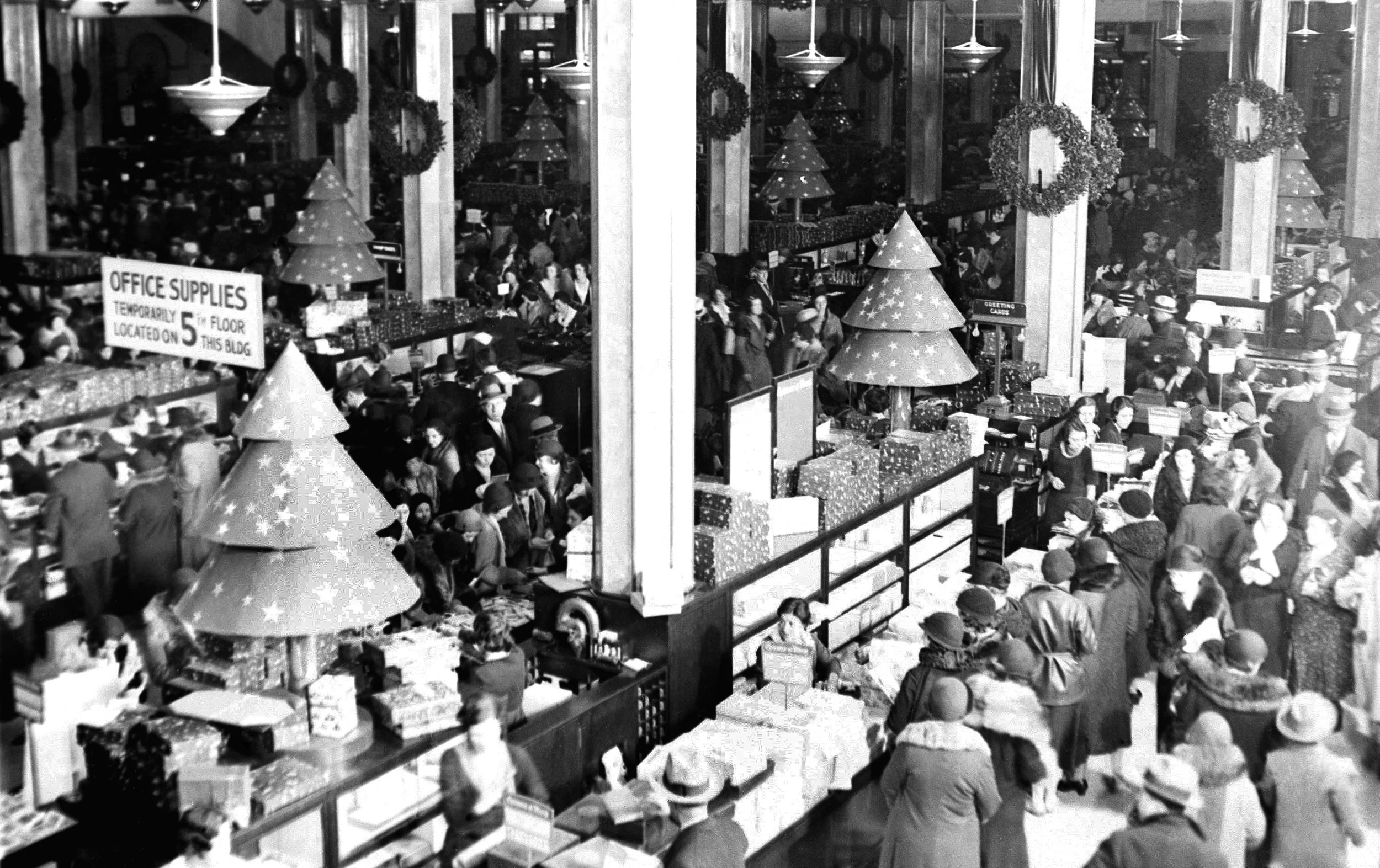 The ground floor of Macy’s department store, located at Broadway and West 34th St., in New York, decorated for the holiday and filled with shoppers, Dec. 11, 1931. (AP Photo)