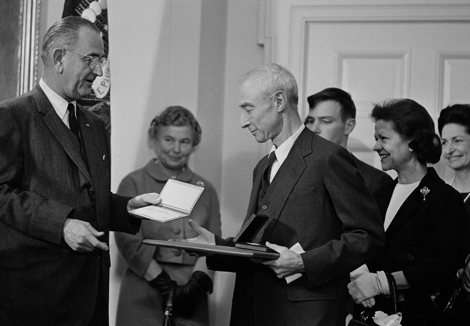 Dr. J. Robert Oppenheimer is shown with President Lyndon B. Johnson during a White House ceremony in which the nuclear physicist received the $50,000 Enrico Fermi science award, Dec. 2, 1963. Lady Bird Johnson is seen at far right. (AP Photo)
