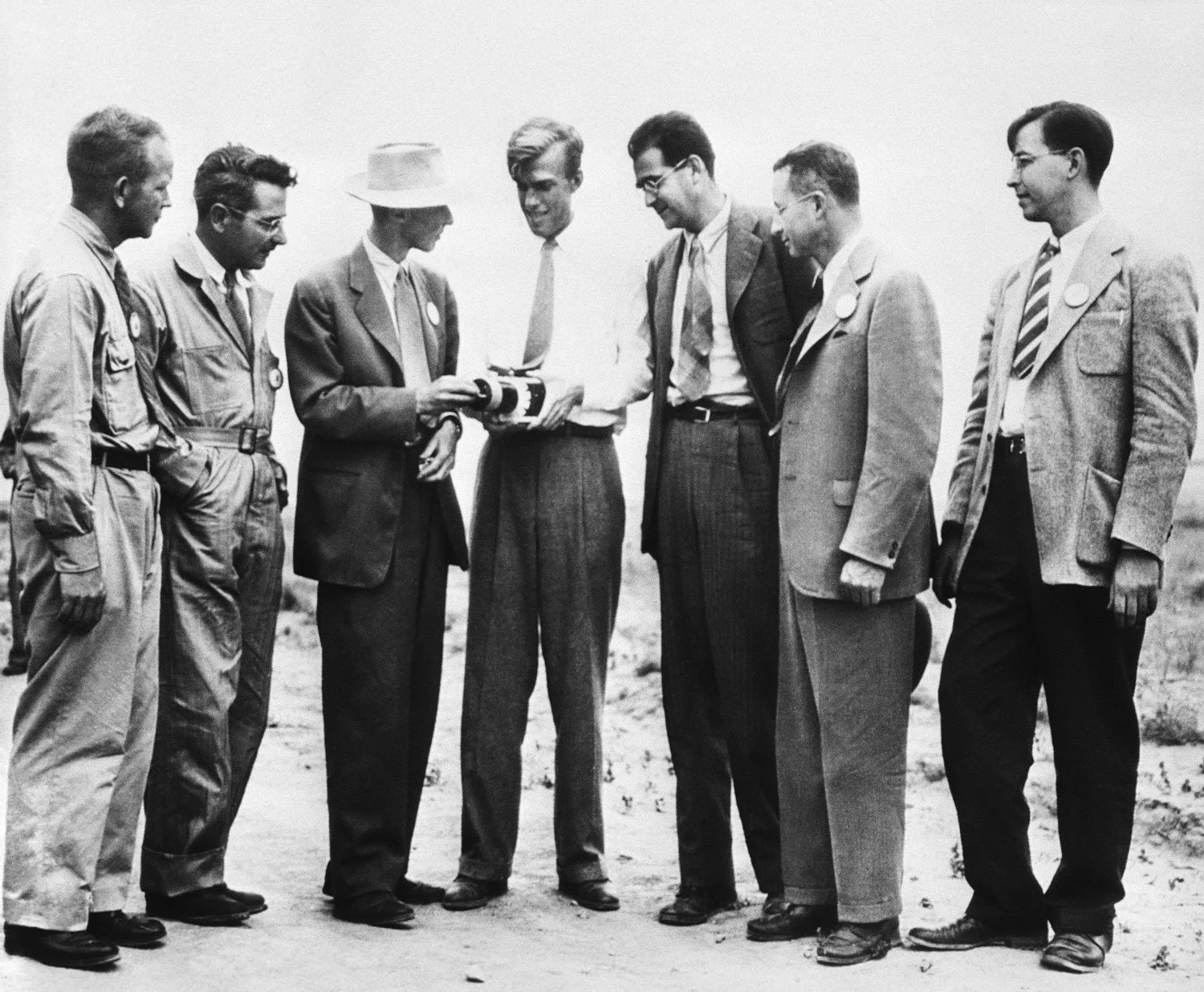 Seven atom bomb scientists look over a roengenometer at the site of the test atom bomb explosion on Sept. 13, 1945. From left to right, Dr. Kenneth T. Bainbridge, Harvard; Dr. Joseph G. Hoffmann, University of Buffalo; Dr. J. Robert Oppenheimer, California; Dr. Louis H. Hempelmann, Washington; Dr. Victor Weisskoff; Dr. Robert F. Bacher, Cornel University; and Dr. Richard W. Dooson, of California. (AP Photo)