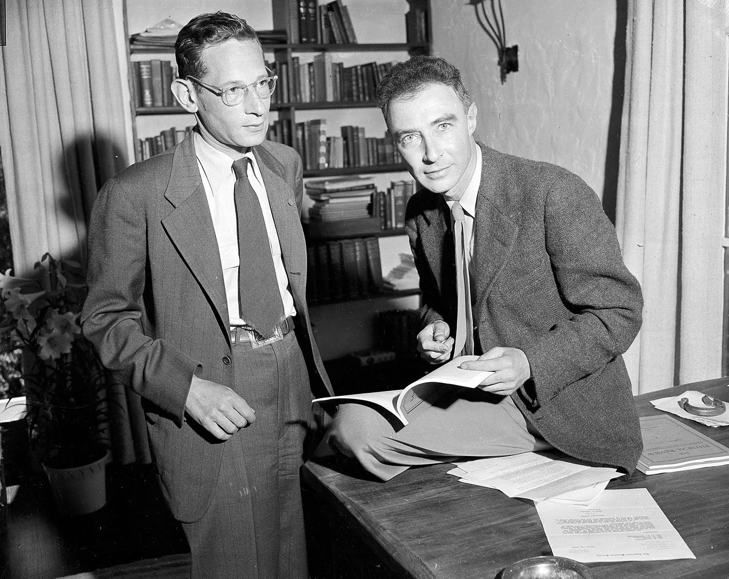 Professor Ernest O. Lawrence, left, and Dr. J. Robert Oppenheimer examine the diffusion pumps for creating an almost perfect vacuum in the accelerating chamber between poles of new 184-inch cyclotron, July 11, 1946, at the University of California's radiation laboratory at Berkeley. (AP Photo/Ernest K. Bennett)