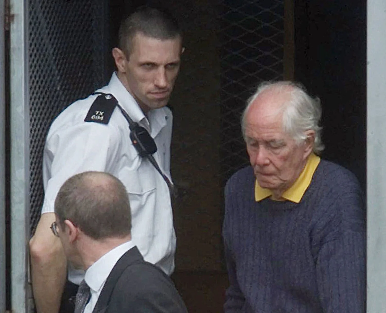 This is a May 7, 2001 file photo of convicted train robber Ronnie Biggs leaving Chiswick Police station on his way to court in West London. Biggs arrived back in Britain from Brazil early Monday where he has been since his escape from prison and his successful avoidance of extradition. Biggs came back to Britain aided by a British tabloid newspaper. Ronnie Biggs was part of a gang that stole sacks containing 2.6 million pounds from a Glasgow to London mail train in August 1963. The haul from what was dubbed the Great Train Robbery would be worth more than 40 million pounds ($60 million) today. Biggs escaped from prison in 1965 by scaling a 30-foot wall with three other inmates. (AP Photo/Alastair Grant, File)