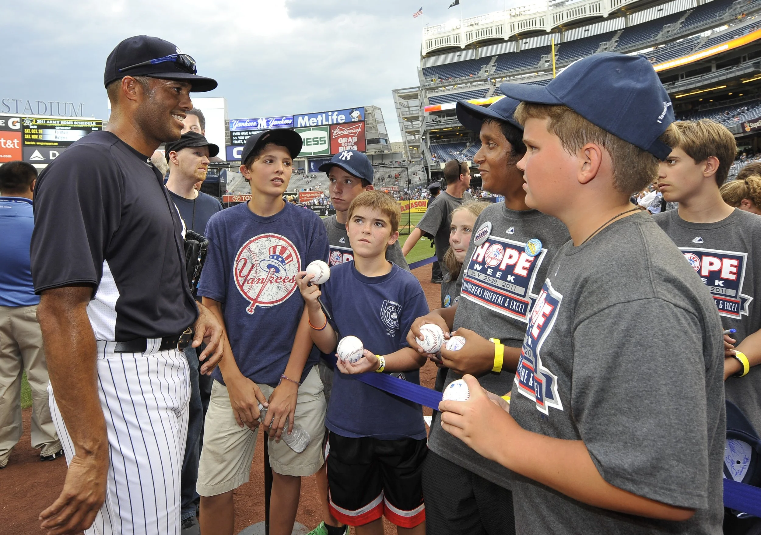 New York Yankees' Mariano Rivera chats with children from Tuesday's Children, children who lost parents in the Sept. 11, 2001, terrorist attacks, on Tuesday, July 26, 2011, before a baseball game at Yankee Stadium between the Yankees and the Seattle Mariners in New York. From left are Cary Jones, Joe McHugh, Amish Sattaluri and Patrick Hannaford. (AP Photo/Kathy Kmonicek)