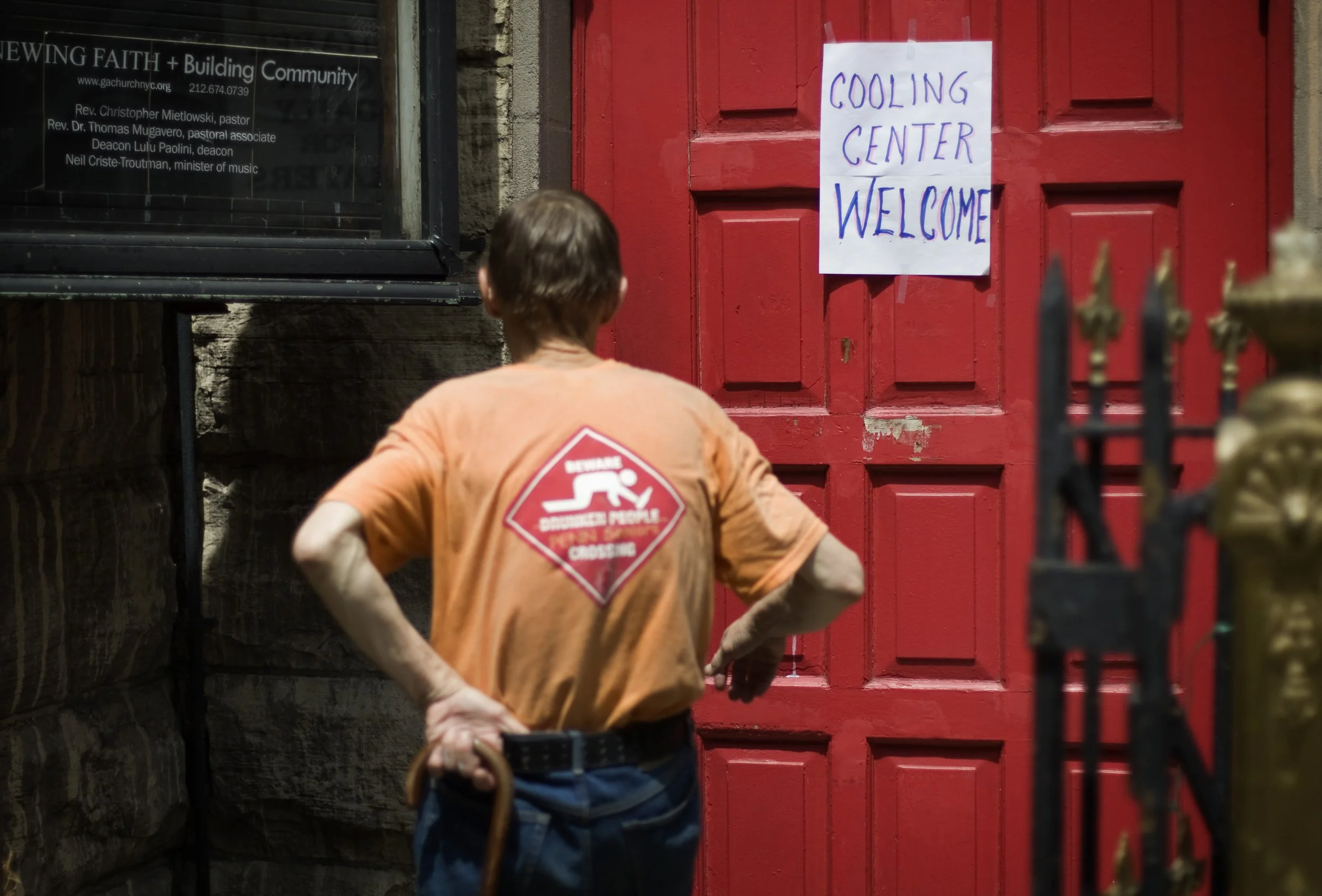 A man enters a designated cooling center at a Senior Center to escape hot weather in New York, Saturday, July 24, 2010. More than 190,000 New Yorkers have visited cooling centers since the summer's first heat wave on June 28, the city said in a statement. (AP Photo/David Goldman)