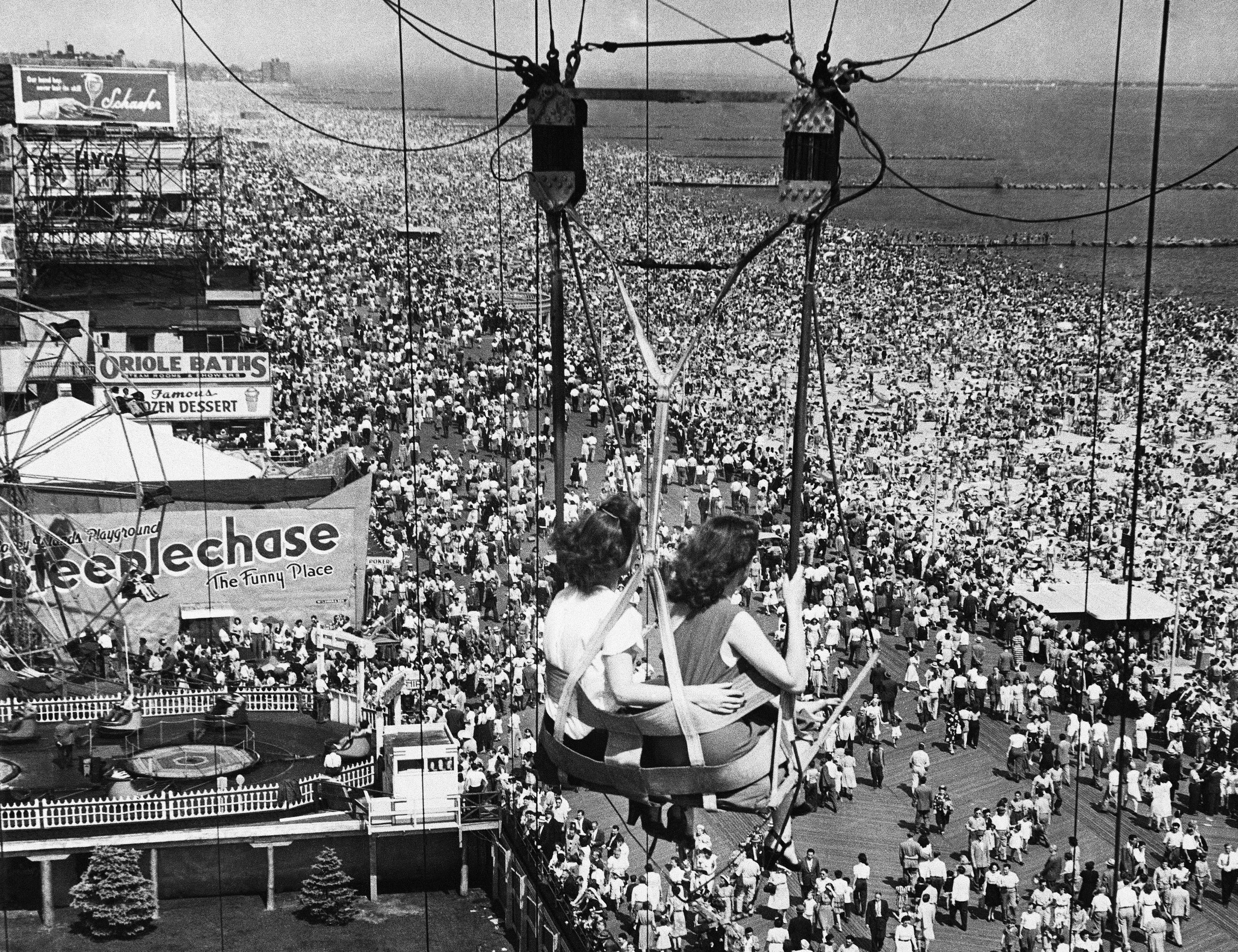 Two passengers on the Parachute Jump ride see throngs of people on the boardwalk and beach at the Coney Island Amusement Park in Brooklyn, New York, July 1, 1957. (AP Photo)