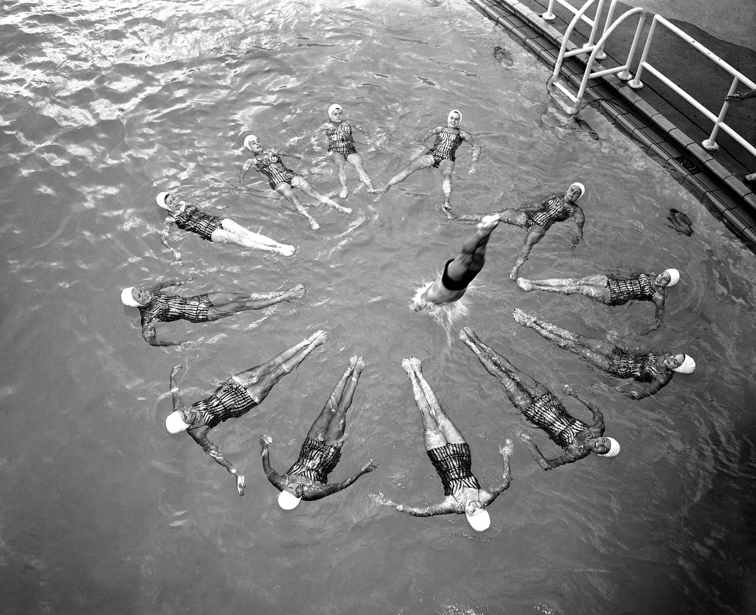 Bobby Knapp dives into the center of a pinwheel formed by members of the water ballet, during the weekly rehearsal for the summer “Aquashow” at Flushing Meadows Amphitheatre, Flushing, New York, Aug. 1, 1953. (AP Photo/Ed Ford)