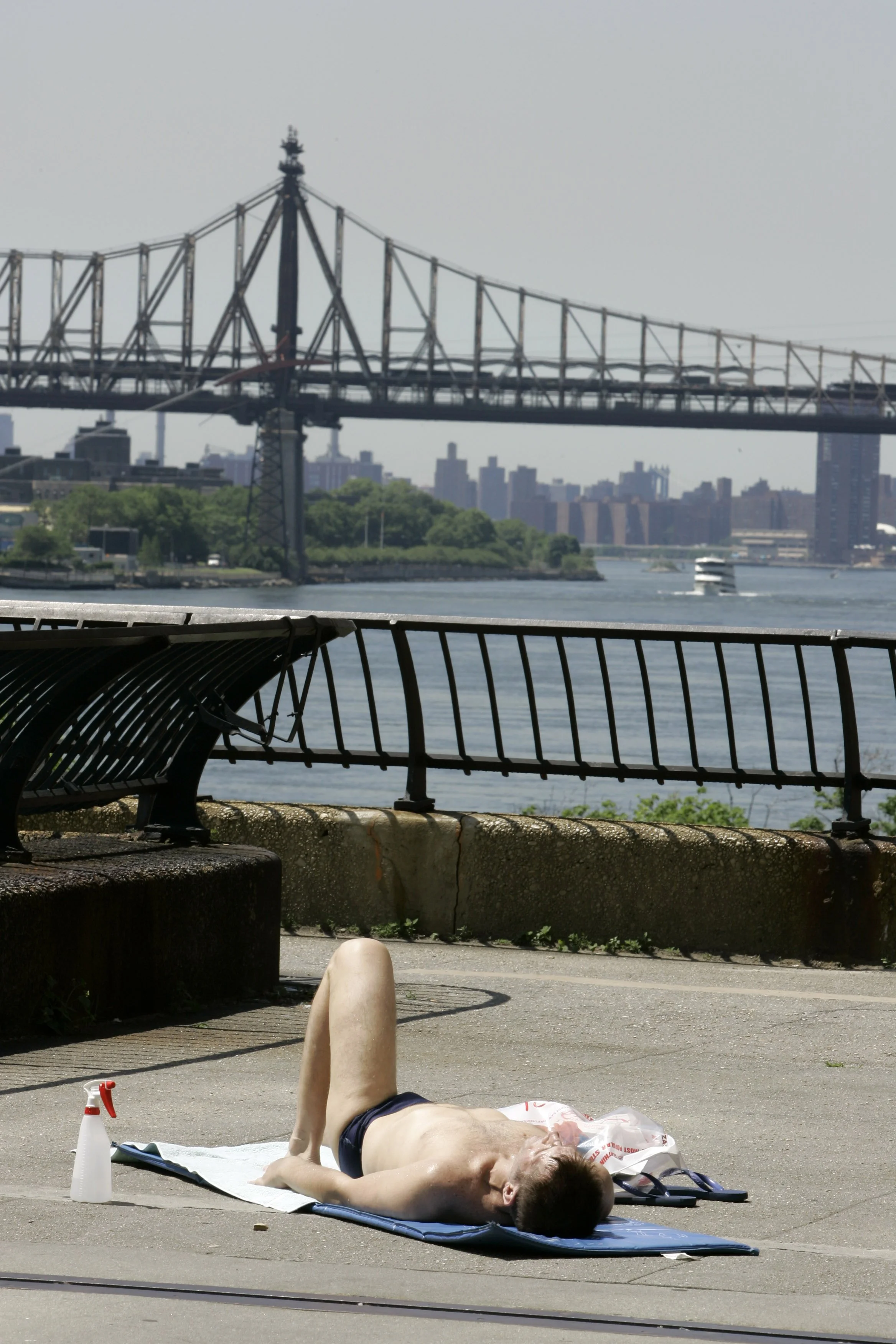 A man sun bathes in Carl Schurz park overlooking the East River and the 59th St. bridge Wednesday, May 30, 2007 in New York. High temperatures are expected to reach the 80s in the New York metro region. (AP Photo/Mary Altaffer)