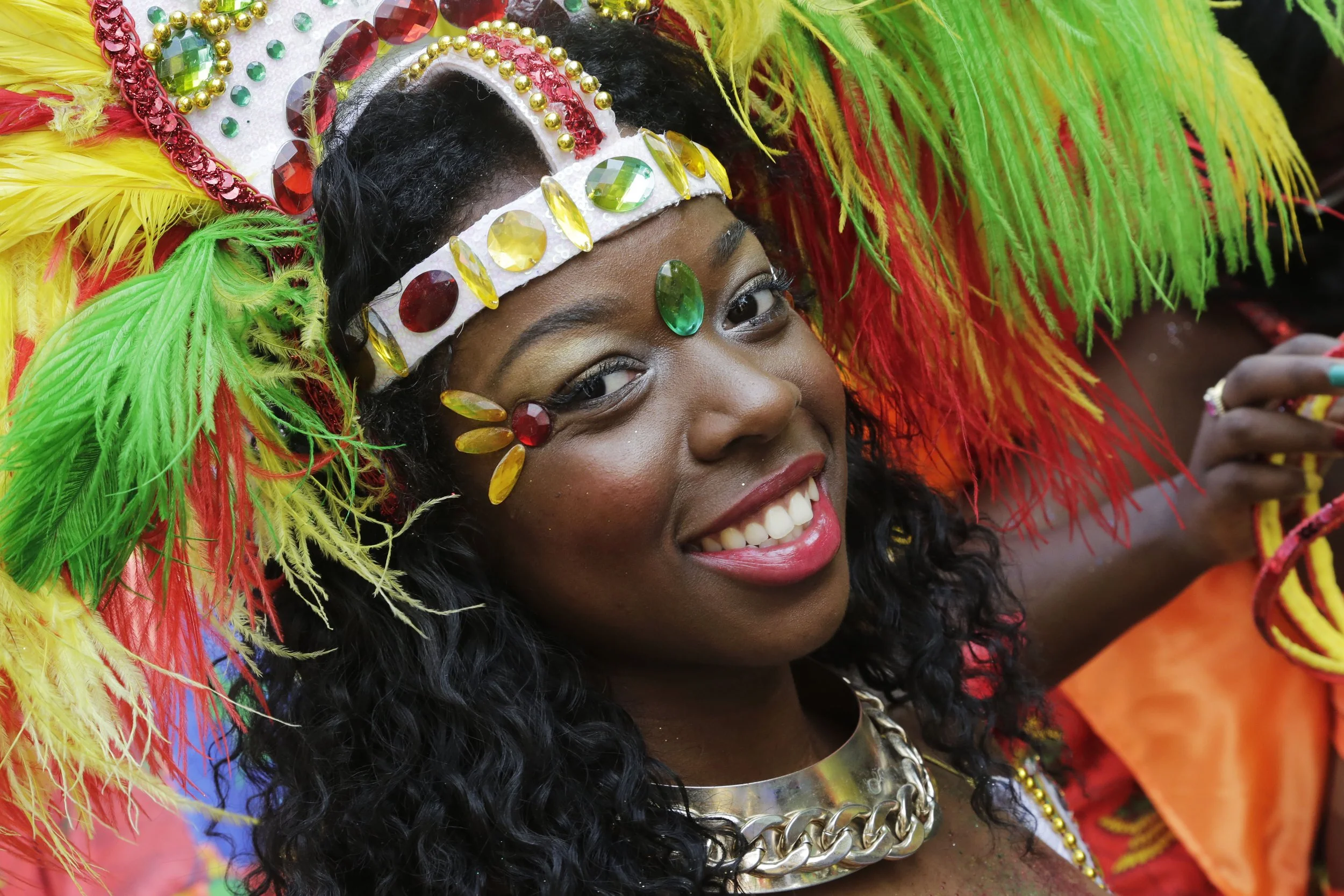 A dancer poses for a photograph during the West Indian Day Parade, Monday, Sept. 1, 2014 in the Brooklyn borough of New York. The annual parade draws about 1 million people along its 2-mile-long route. (AP Photo/Mark Lennihan)
