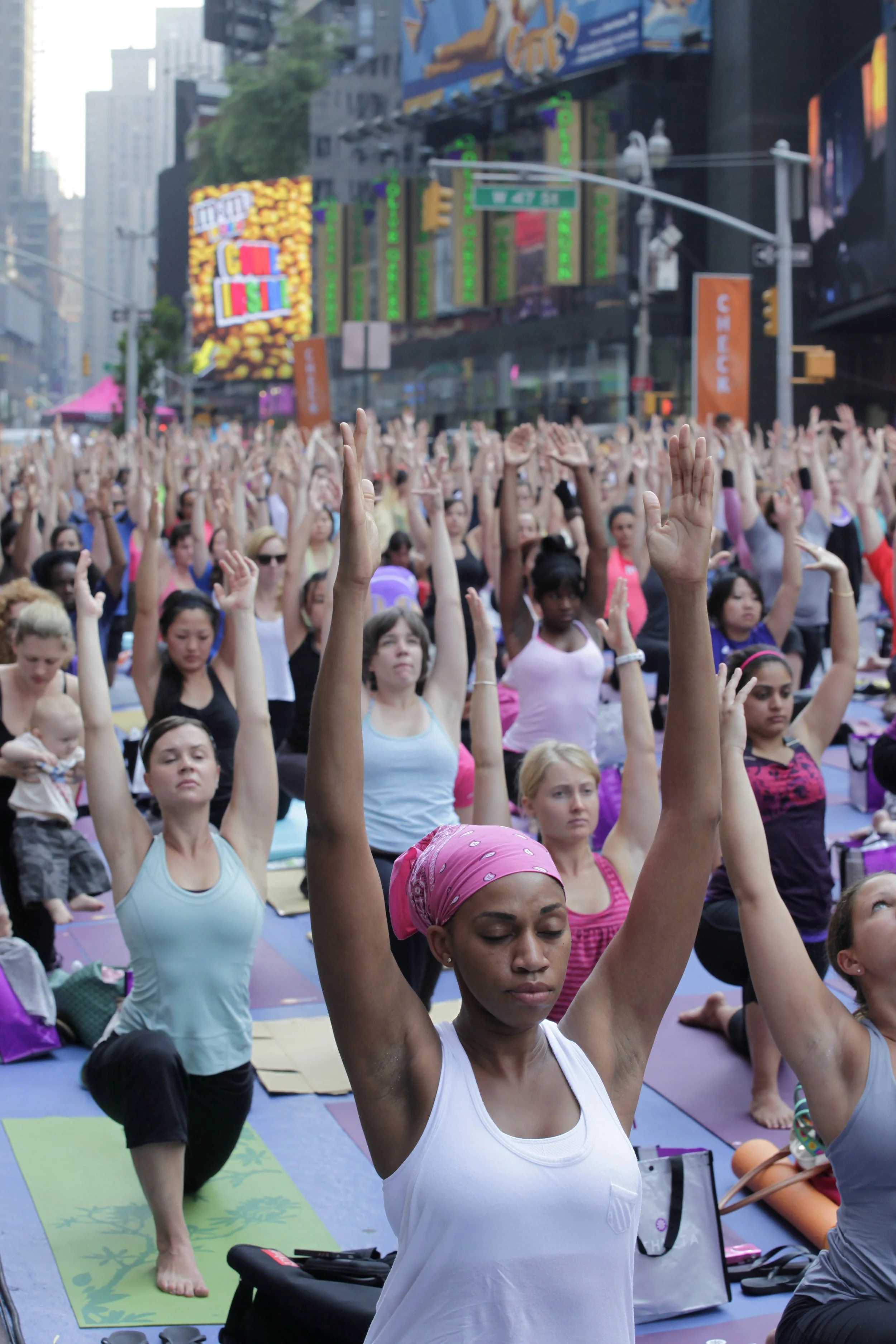 Thousands of yoga enthusiasts convene in New York's Times Square to mark the summer solstice, Wednesday, June 20, 2012. Temperatures are expected to be near 100 degrees (37C) Wednesday. (AP Photos/Mark Lennihan)