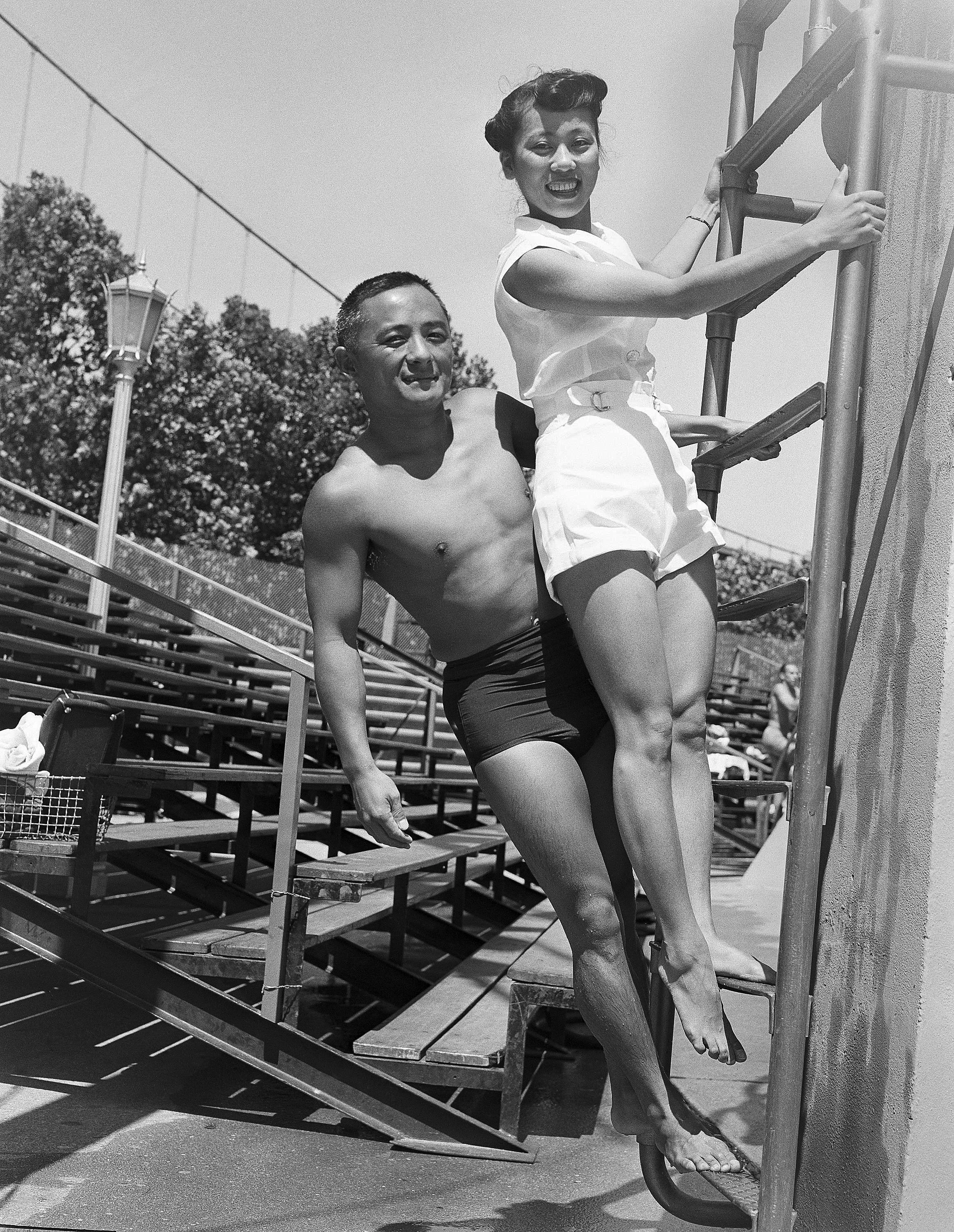Maj. Samuel Lee, left, and his wife Rosalind look over Astoria Park pool in the Queens borough of New York, just before the Olympic tryouts, June 30, 1952. Maj. Lee is an army doctor stationed at Letterman Army Hospital at San Francisco and is the 1948 Olympic 10-meter diving champion. (AP Photo/Jacob Harris)
