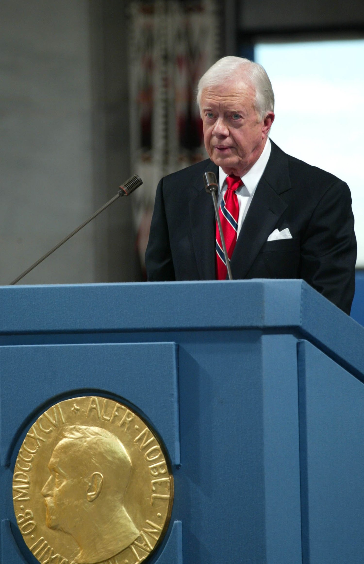 Former President Jimmy Carter gives a speech after receiving the 2002 Nobel Peace Prize, at Oslo City Hall, Norway, Dec. 10, 2002. (AP Photo/Bjoern Sigurdsoen, Pool)