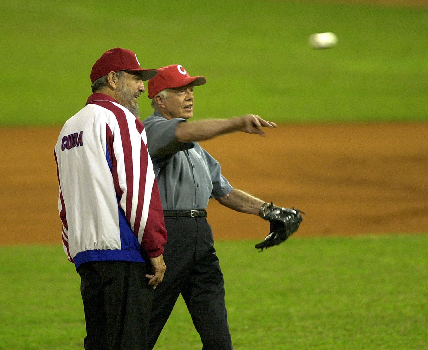 Former President Jimmy Carter, right, accompanied by Cuban President Fidel Castro, warms up before throwing the first pitch in an all-star baseball game at the Latinamerican Stadium in Havana, Cuba, May 14, 2002. (AP Photo/Cristobal Herrera)