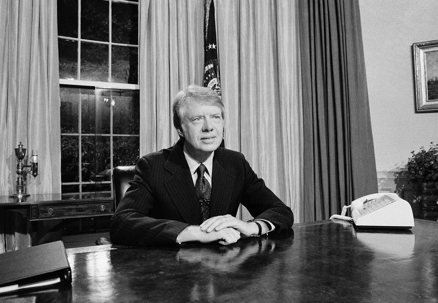 President Jimmy Carter is seated behind his desk in the Oval Office of the White House moments before addressing the nation on the administrations new energy policies, April 18, 1977, Washington, D.C. Carter made his statements on national television and radio. (AP Photo/Charles W. Harrity)