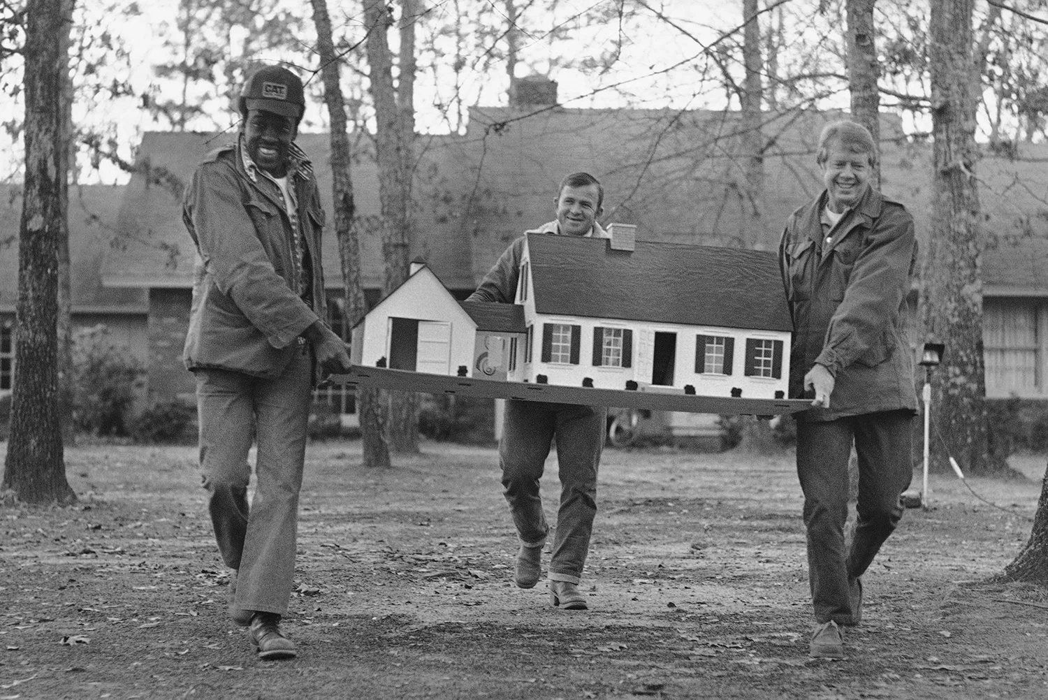 President-elect Jimmy Carter carriers Amy's doll house from his home in Plains, Ga., Jan. 17, 1977, to a truck which will carry it to their new home, The White House, in Washington, D.C. A worker from Carter's peanut warehouse gives a hand, they are followed by a Secret Service agent. (AP Photo)