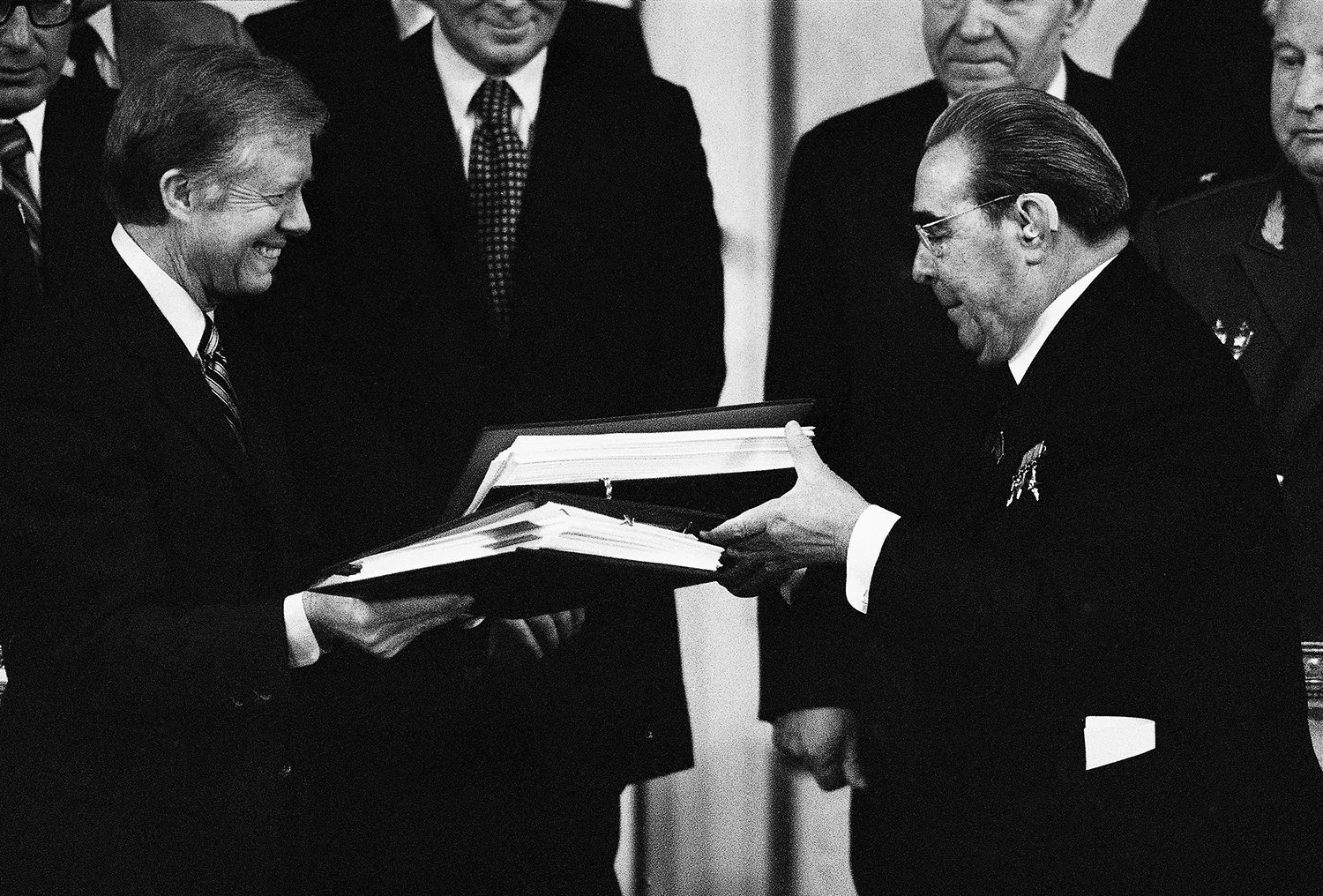 U.S. President Jimmy Carter, left, smiles at Soviet President and Party Chief Leonid Brezhnev at the Vienna Imperial Hofburg Palace, as both exchange documents of SALT II Treaty after the signing ceremony, June 18, 1979, Vienna, Austria. (AP Photo)