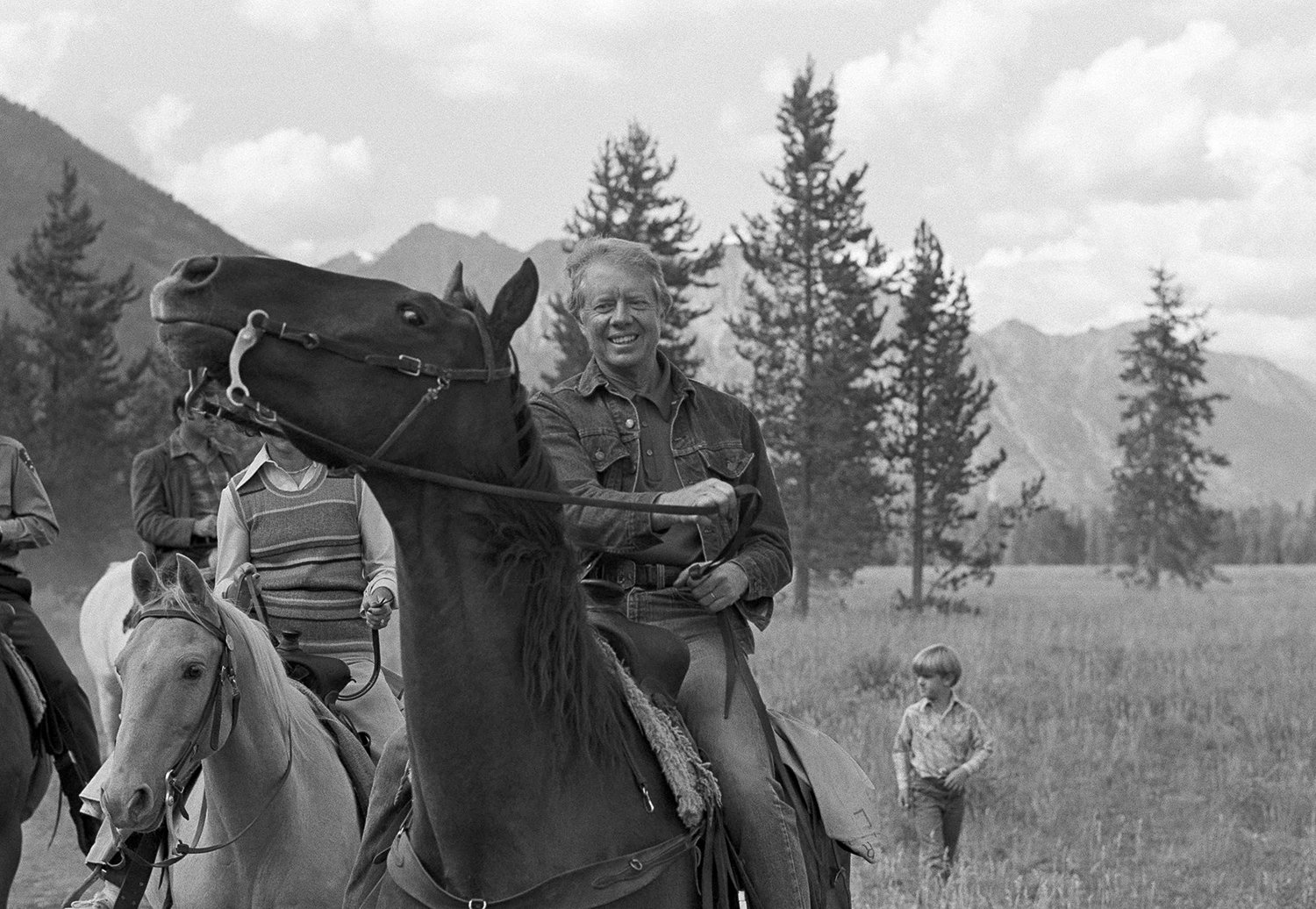 President Jimmy Carter reins in "Big Red" as he and members of his family returned from a horseback ride near Jenny Lake in Wyoming, Aug. 29, 1978. (AP Photo)