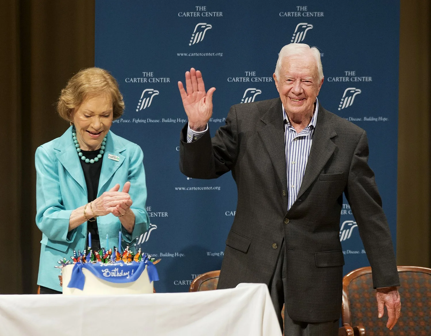 Former President Jimmy Carter, right, waves after blowing out candles on a birthday cake as wife Rosalynn looks on during his 90th birthday celebration, Oct. 1, 2014, in Atlanta. (AP Photo/David Goldman)