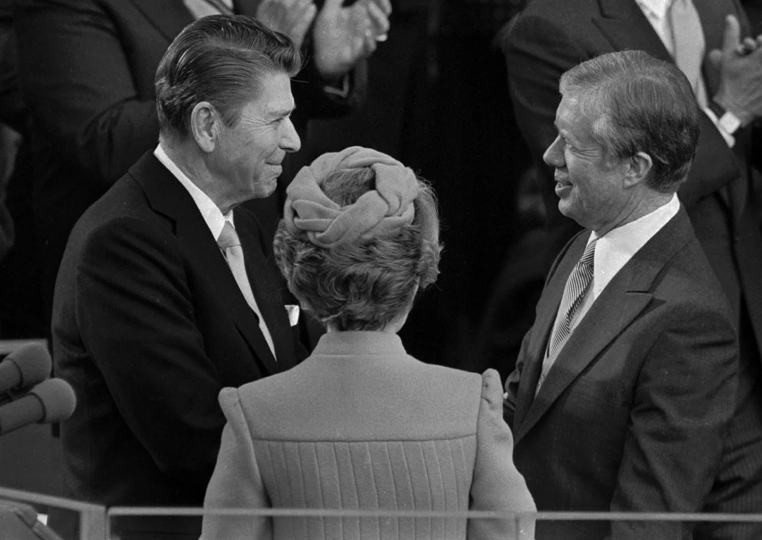 Incoming President Ronald Reagan shakes hands with outgoing President Jimmy Carter on Tuesday, Jan. 20, 1981 during Reagan's swearing in ceremony. Reagan's wife Nancy is between them with her back to the camera. (AP Photo)