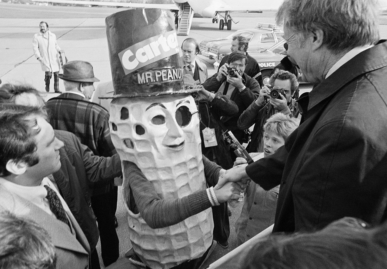 A person in a Mr. Peanut costume with a Carter sticker, draws a smile and a handshake from Jimmy Carter, the Democratic presidential candidate, Oct. 28, 1976, Erie, Pa. Carter is noted for his peanut farming in Georgia. (AP Photo)