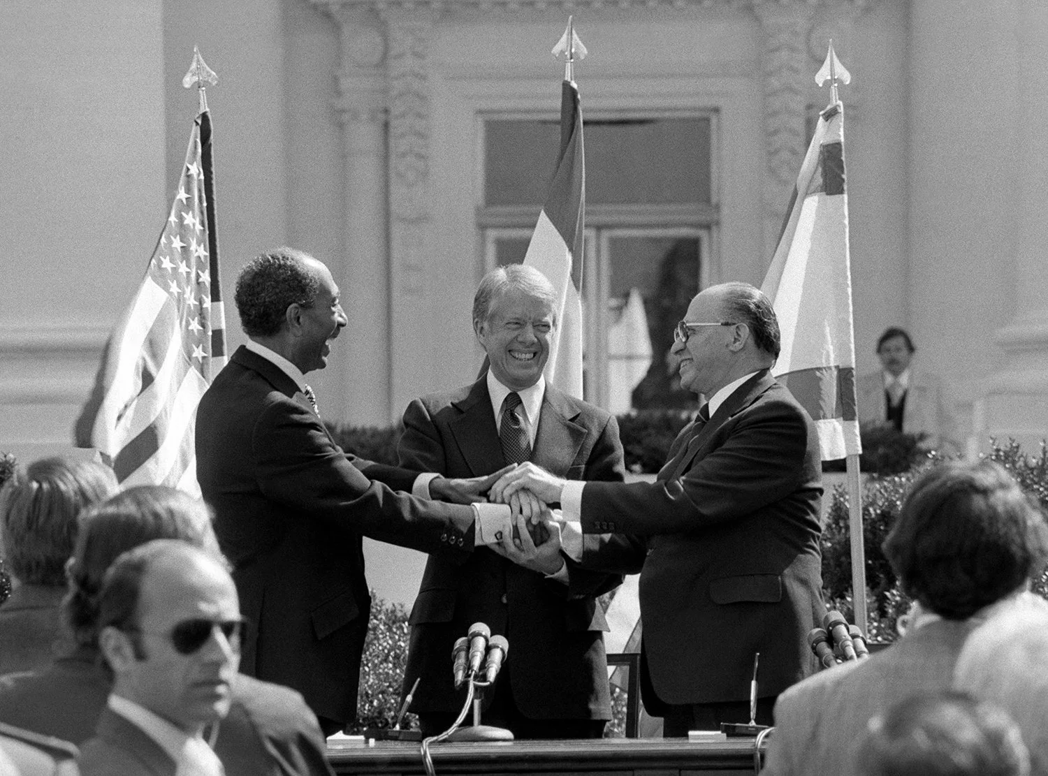Egyptian President Anwar Sadat, U.S. President Jimmy Carter and Israeli Prime Minister Menachem Begin clasp hands on the north lawn of the White House in Washington on March 26, 1979, as they completed the signing of the peace treaty between Egypt and Israel. (AP Photo)