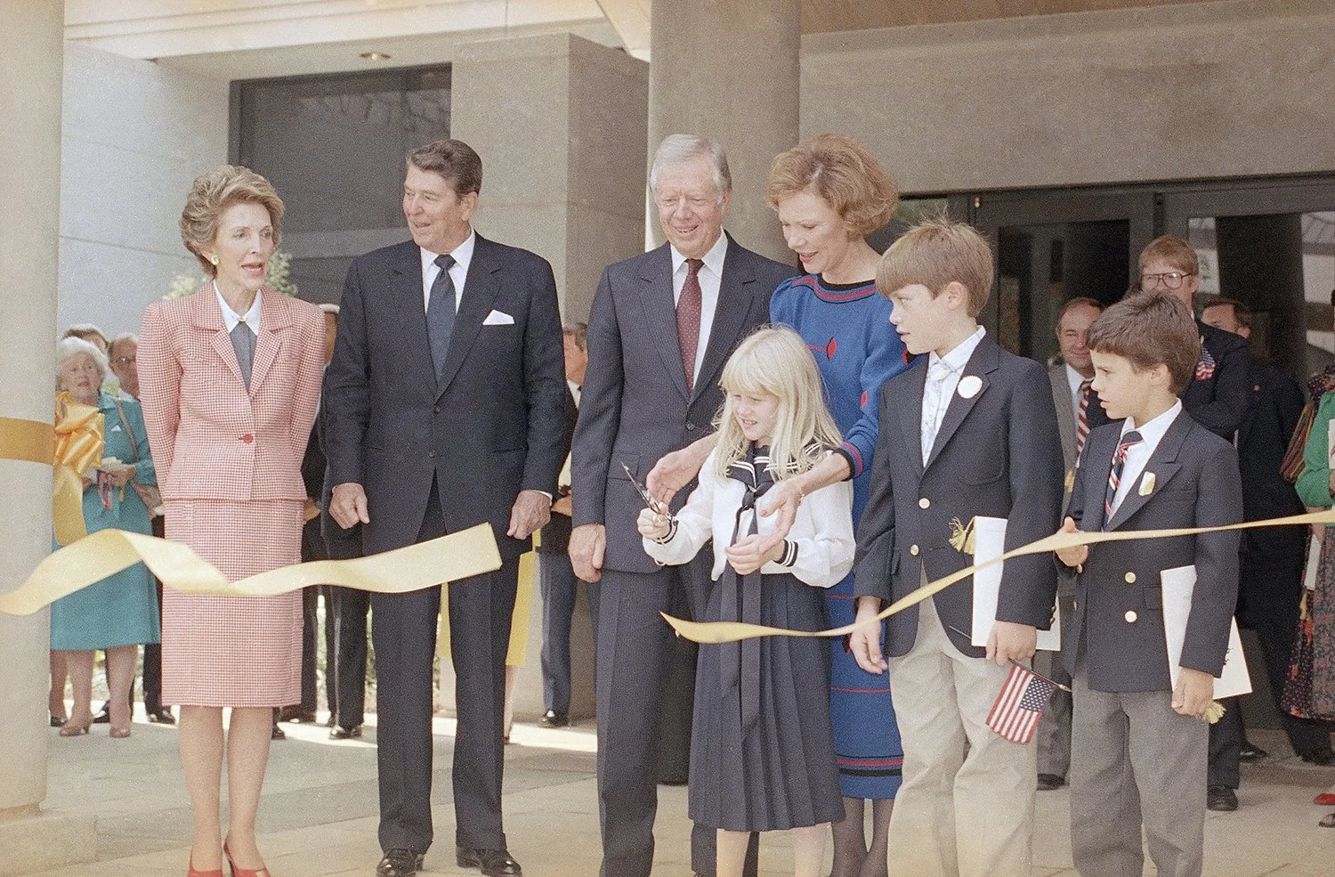 President Ronald Reagan and first lady Nancy Reagan, left, watch grandchildren of former President Jimmy Carter and Rosalynn Carter as they cut the ribbon to open the Carter Presidential Library in Atlanta, Oct. 1, 1986. The children are, from left: Sarah, Jason and James Earl Carter IV. (AP Photo/Barry Thumma)