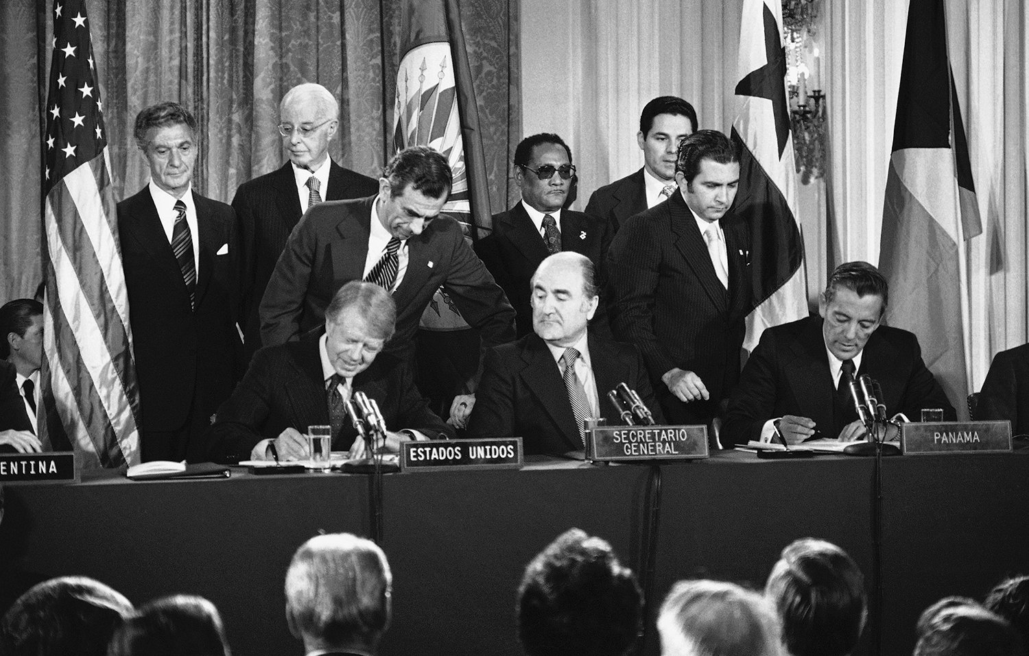Officials execute the Panama Canal treaty, Sept. 7, 1977, at the Pan American Union in Washington. From left are: President Jimmy Carter, Organization of American States Secretary General Alejandro Orfila, and Panama’s head of government Omar Torrijos. (AP Photo)