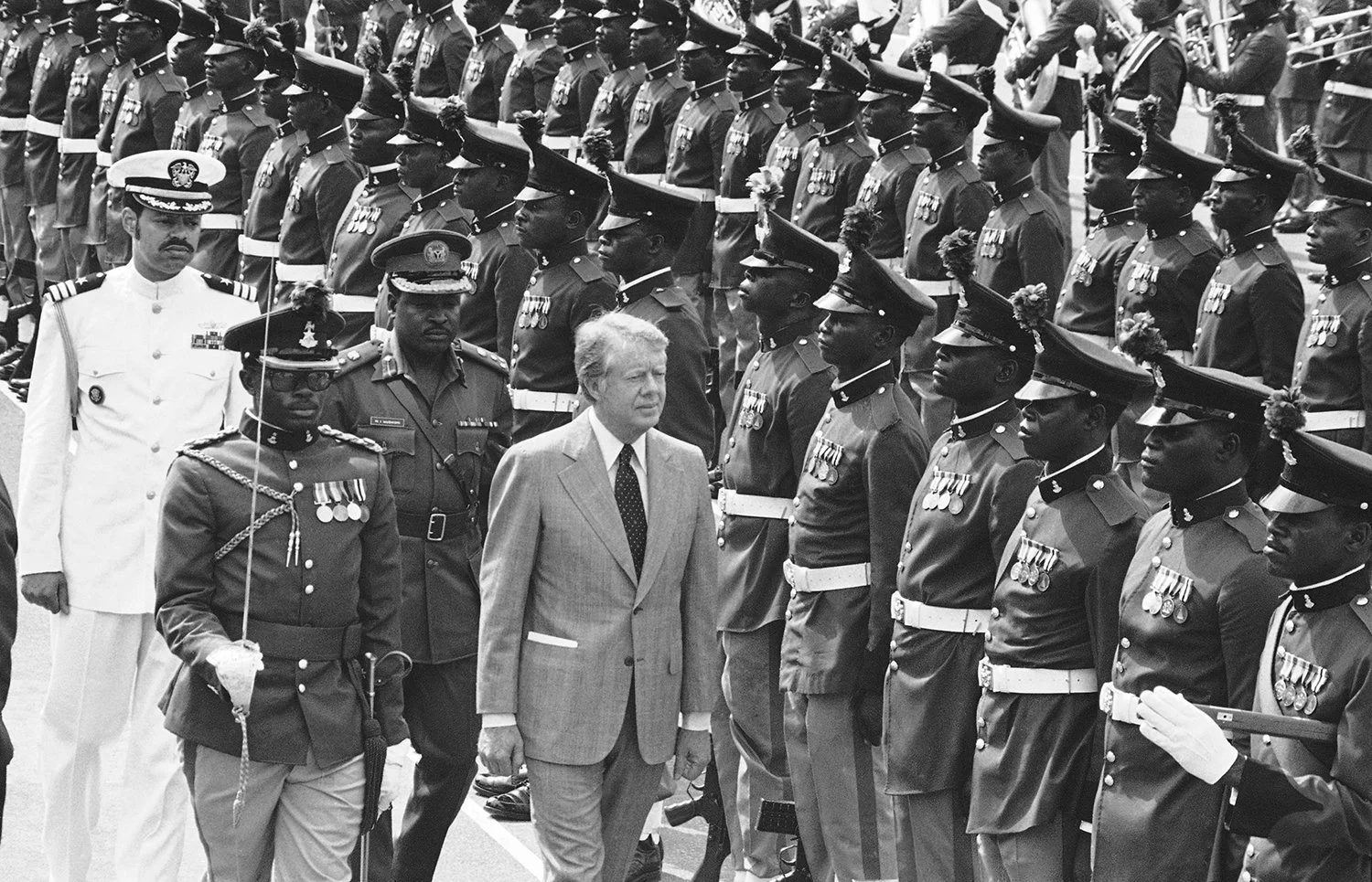President Jimmy Carter reviews rows of honor guards during arrival ceremonies at the Dodan Barracks in Lagos, Nigeria, Saturday, April 1, 1978. (AP Photo)