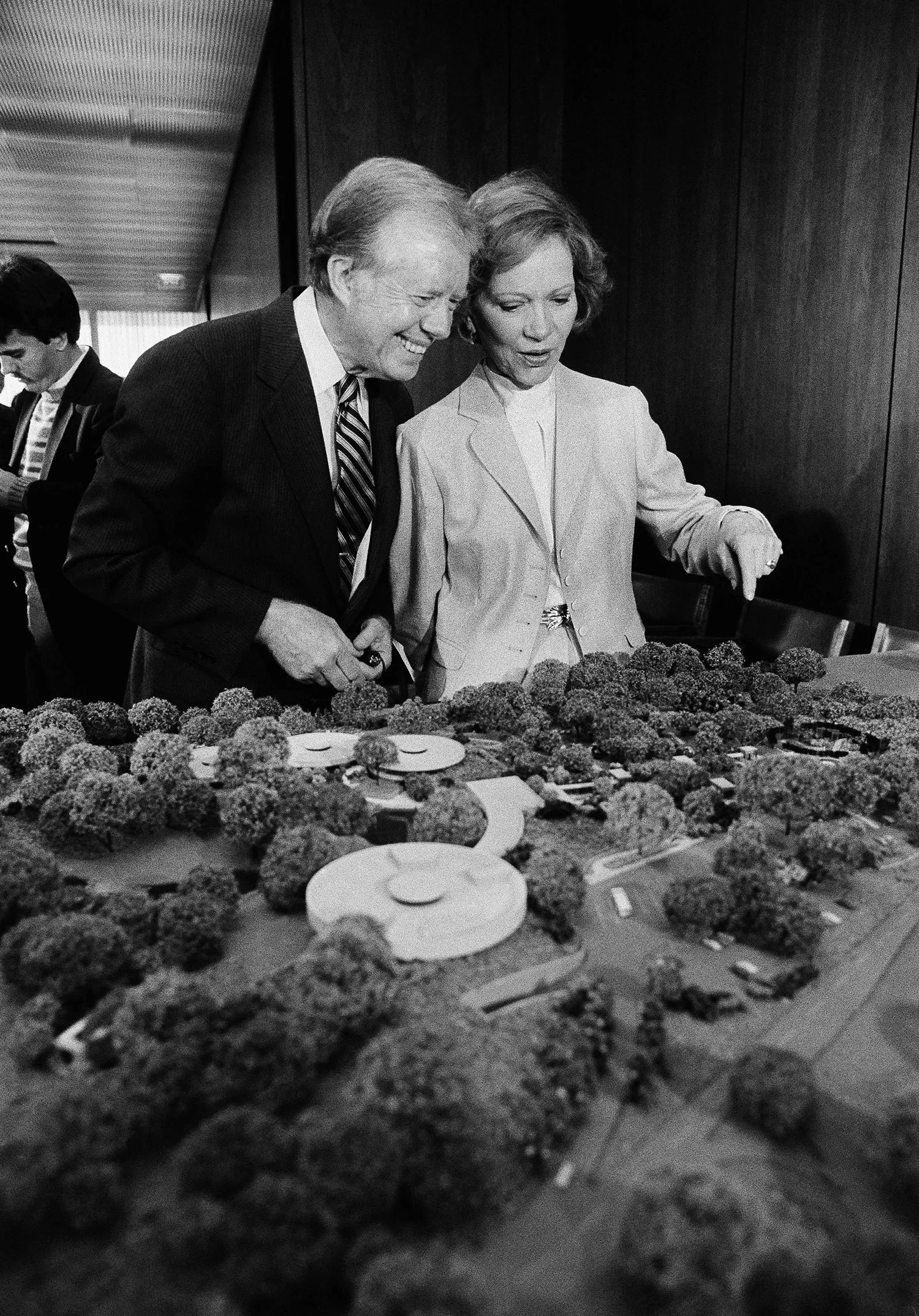 Former President Jimmy Carter and his wife Rosalynn discuss an architect's model of the proposed Carter Presidential Library and the Carter Center of Emory University during a press conference at Emory University, Sept. 22, 1983 in Atlanta. (AP Photo/Ric Feld)