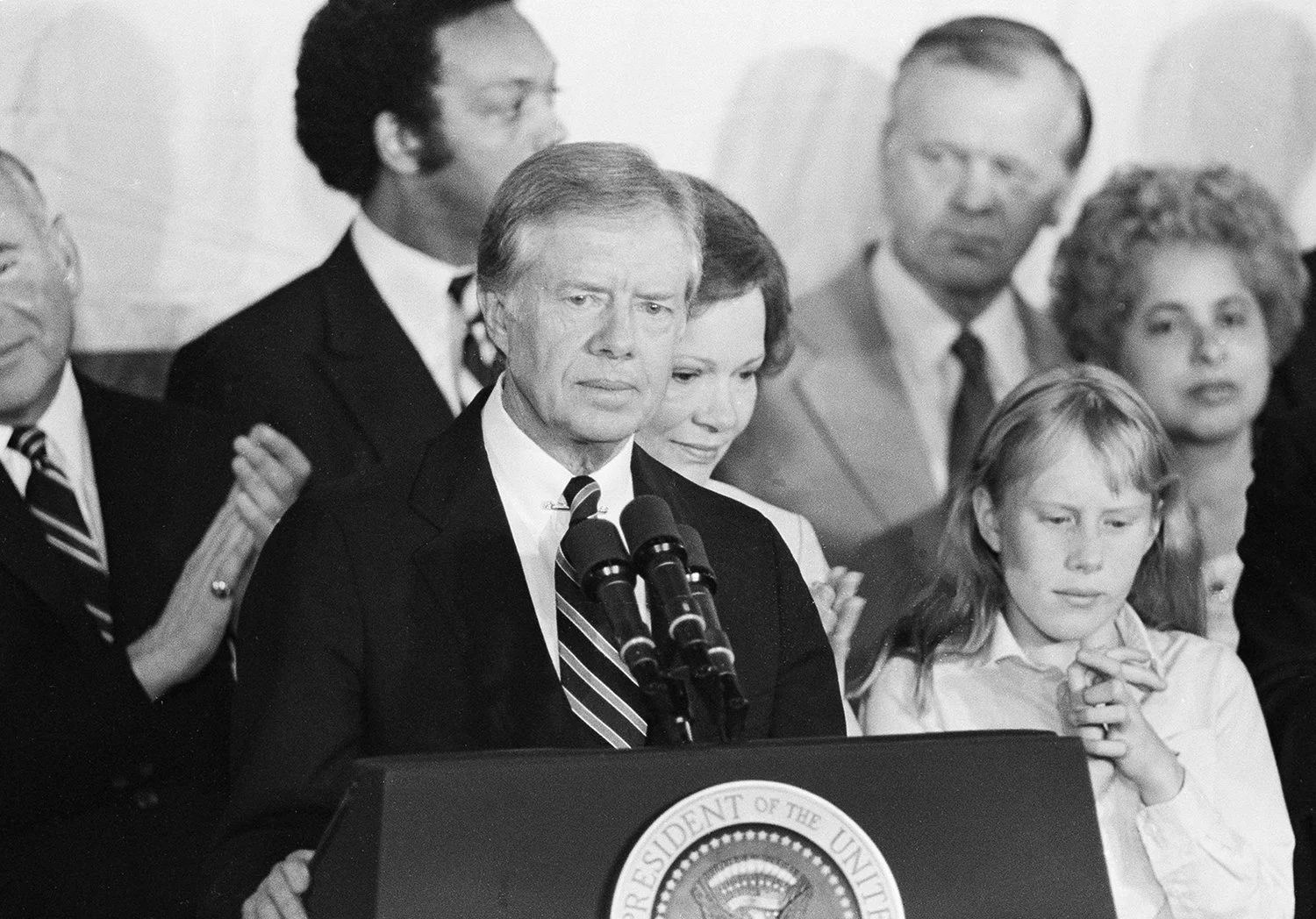 U.S. President Jimmy Carter concedes defeat in the presidential election as he addresses a group of Carter-Mondale supporters in Washington, D.C., Nov. 4, 1980. Standing behind Carter is his wife, Rosalynn, and at right is their daughter Amy. (AP Photo/Barry Thumma)