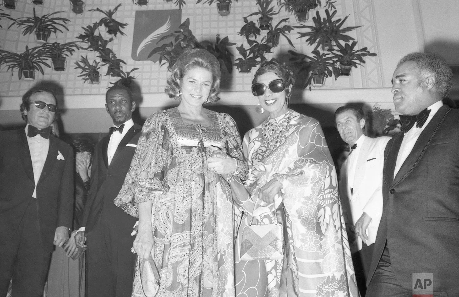 Ingrid Bergman, jury president, left, and Josephine Baker, right, leave the Festival Palace in Cannes, France, after viewing the Swedish film "Cries and Whispers", on May 25, 1973. (AP Photo)