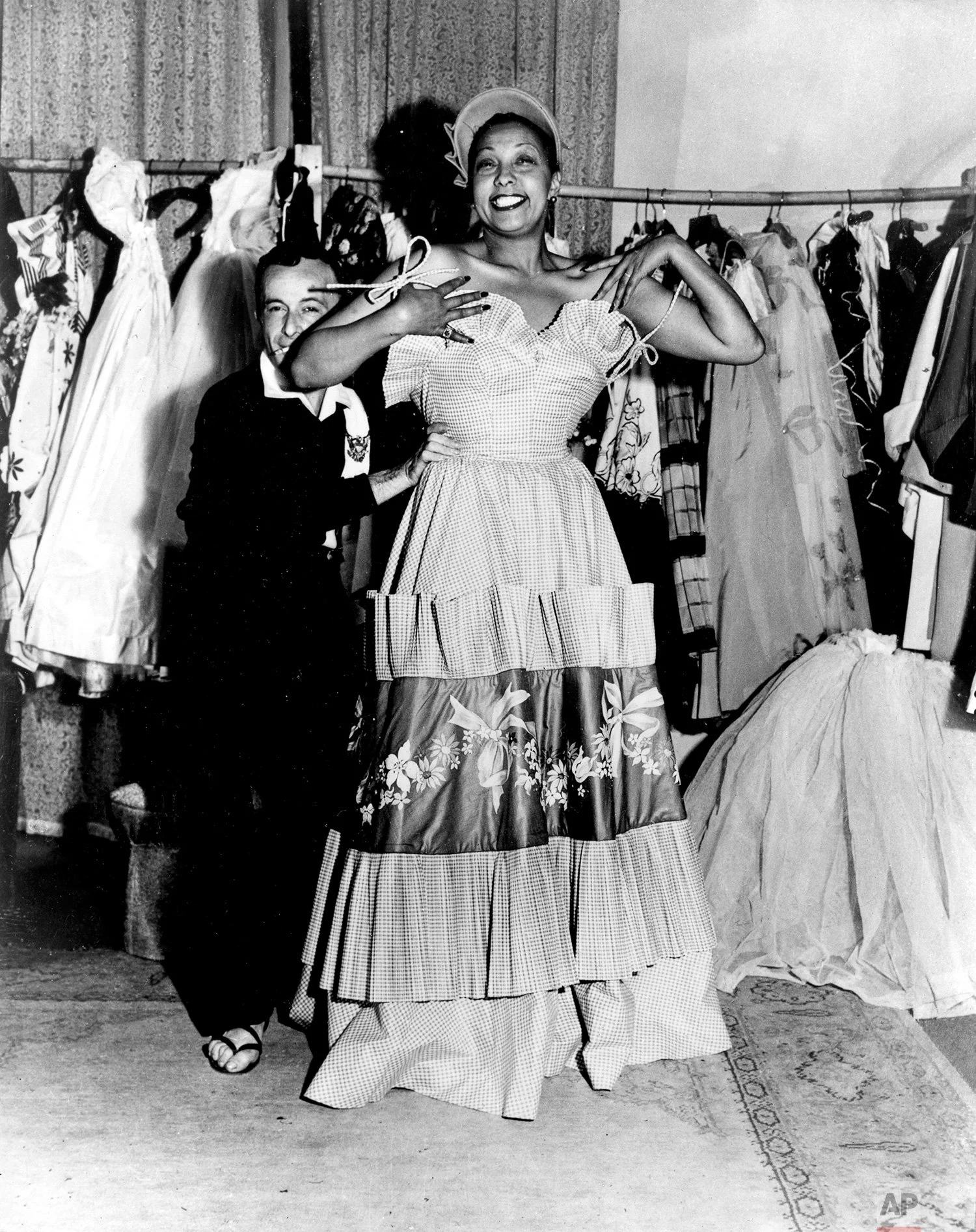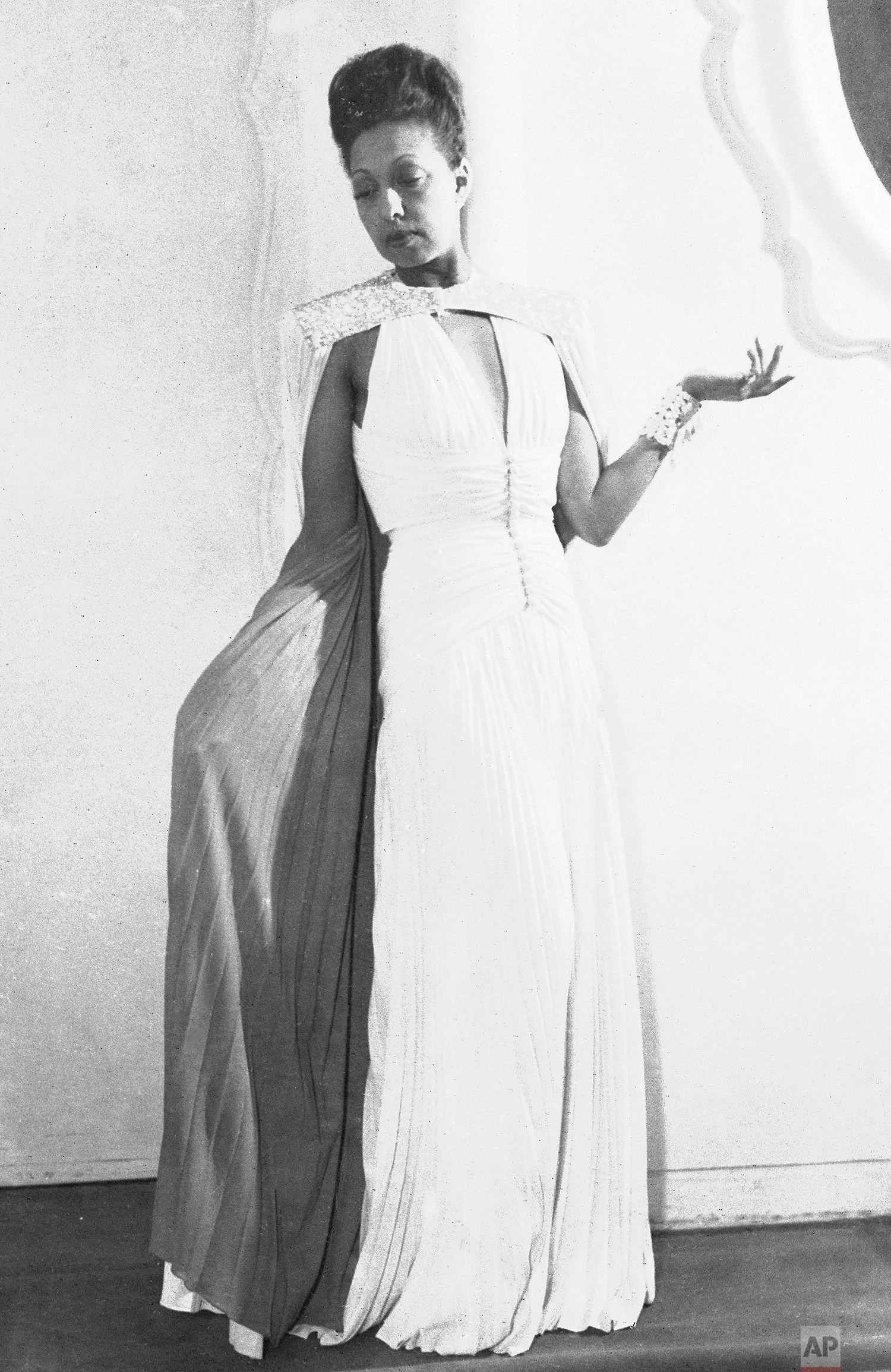 French cabaret star Josephine Baker models a glamorous dress during a private preview of the gowns and hats she will wear when she tours with E.N.S.A. (The Entertainments National Service Association) shortly, at Jean Dresses, her dressmakers in Paris, France, in March 1945. (AP Photo/Peter J. Carroll)
