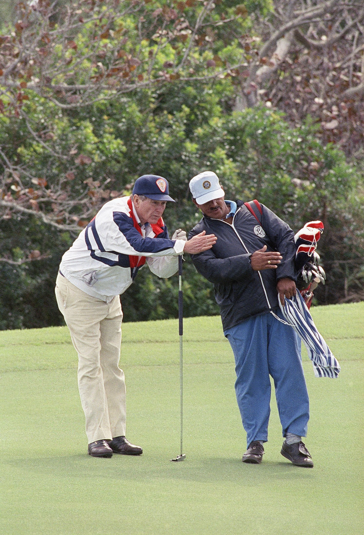 President George H.W. Bush gets some advice on a putt from caddy John Kelly, while playing the course at Mid Ocean Club in Bermuda, March 17, 1991. The president is on the island for Bermuda summit meetings and some recreation. (AP Photo/Barry Thumma)