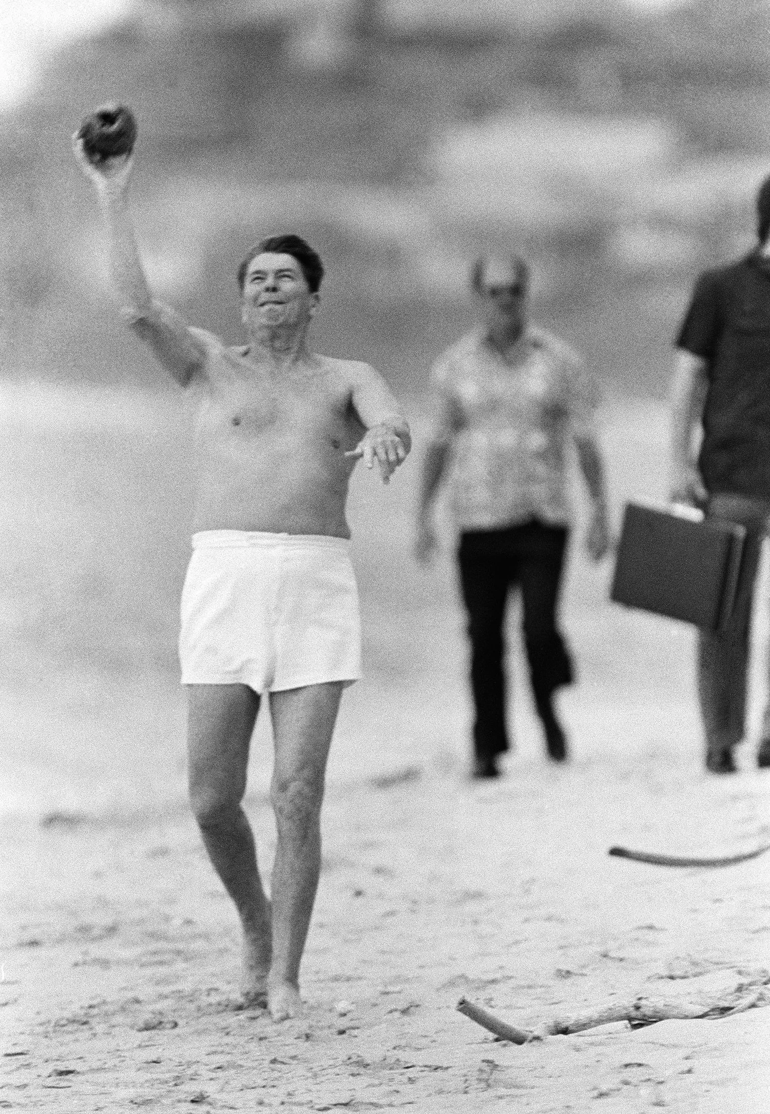President Ronald Reagan tosses a coconut during a midday break at Kahala Beach, in the midst of a stroll and swim in Honolulu, Hawaii, on April 23, 1984. (AP Photo/Scott Stewart)