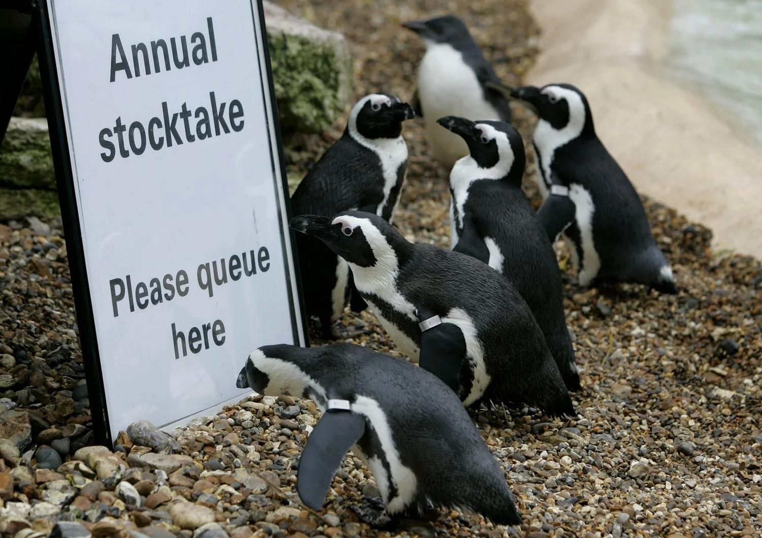 Penguins investigate a sign during the annual stock take at London Zoo, London, Jan. 11, 2007. (AP Photo/Kirsty Wigglesworth)