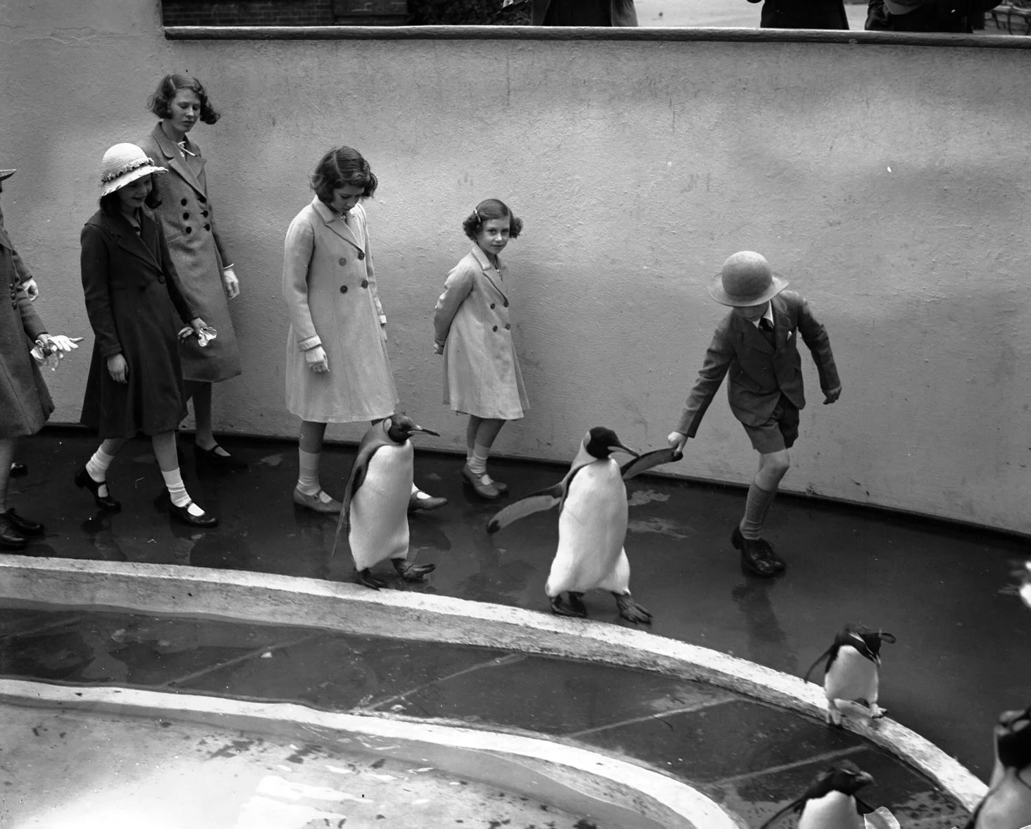Britain's Princess Elizabeth, later Queen Elizabeth II, third from right, and her sister Princess Margaret Rose, second from right, visit the penguins at London Zoo, June 30, 1938. At right, holding the penguins fin, is Shaun Plunket. (AP Photo)