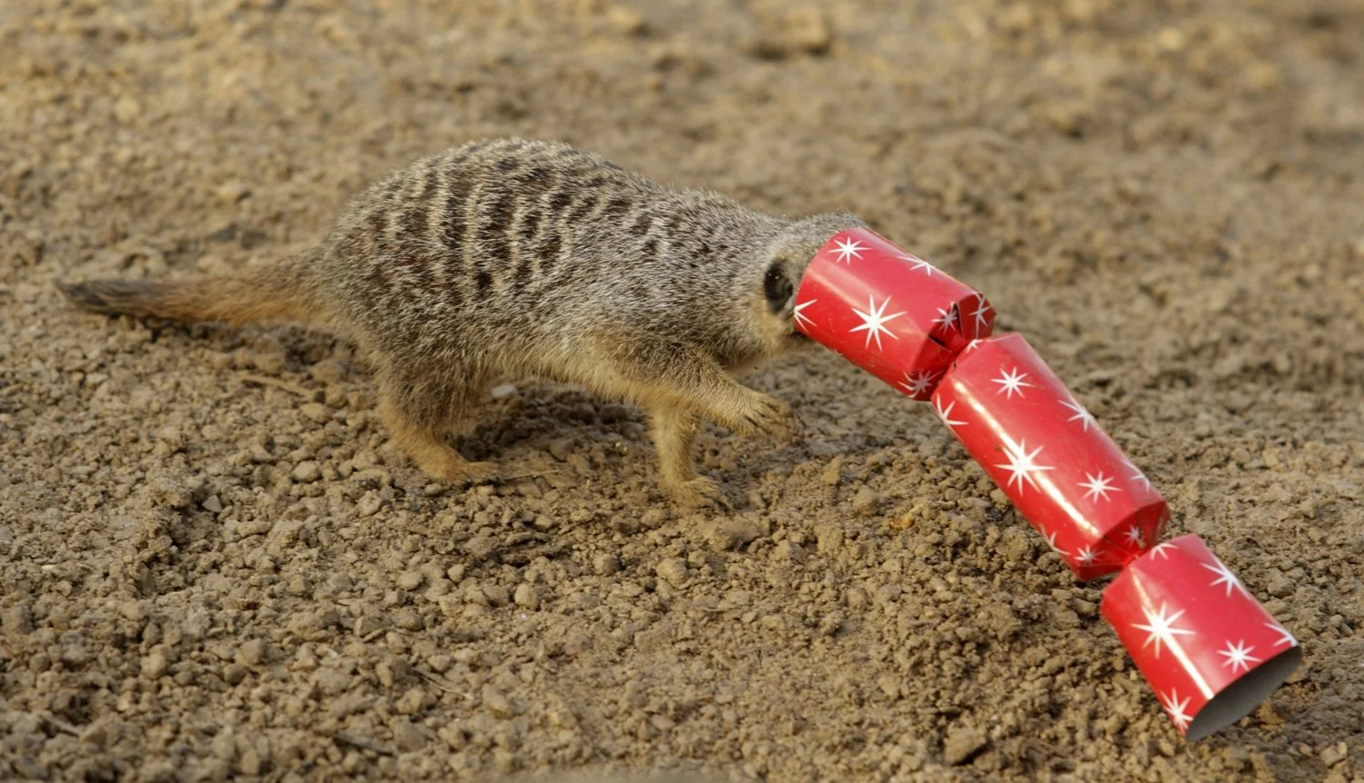 A meerkat tries to eat meal worms stuffed inside a Christmas cracker at London Zoo, Dec. 17, 2009. (AP Photo/Matt Dunham)