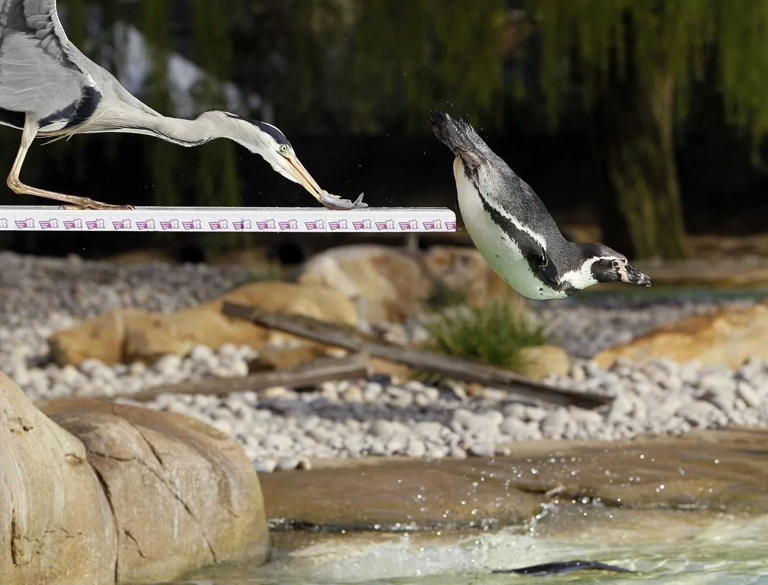 A heron eats a fish, whilst a penguin takes a dive from the new Olympic London 2012 style diving board installed in the penguin enclosure at London Zoo, March 29, 2012. (AP Photo/Kirsty Wigglesworth)