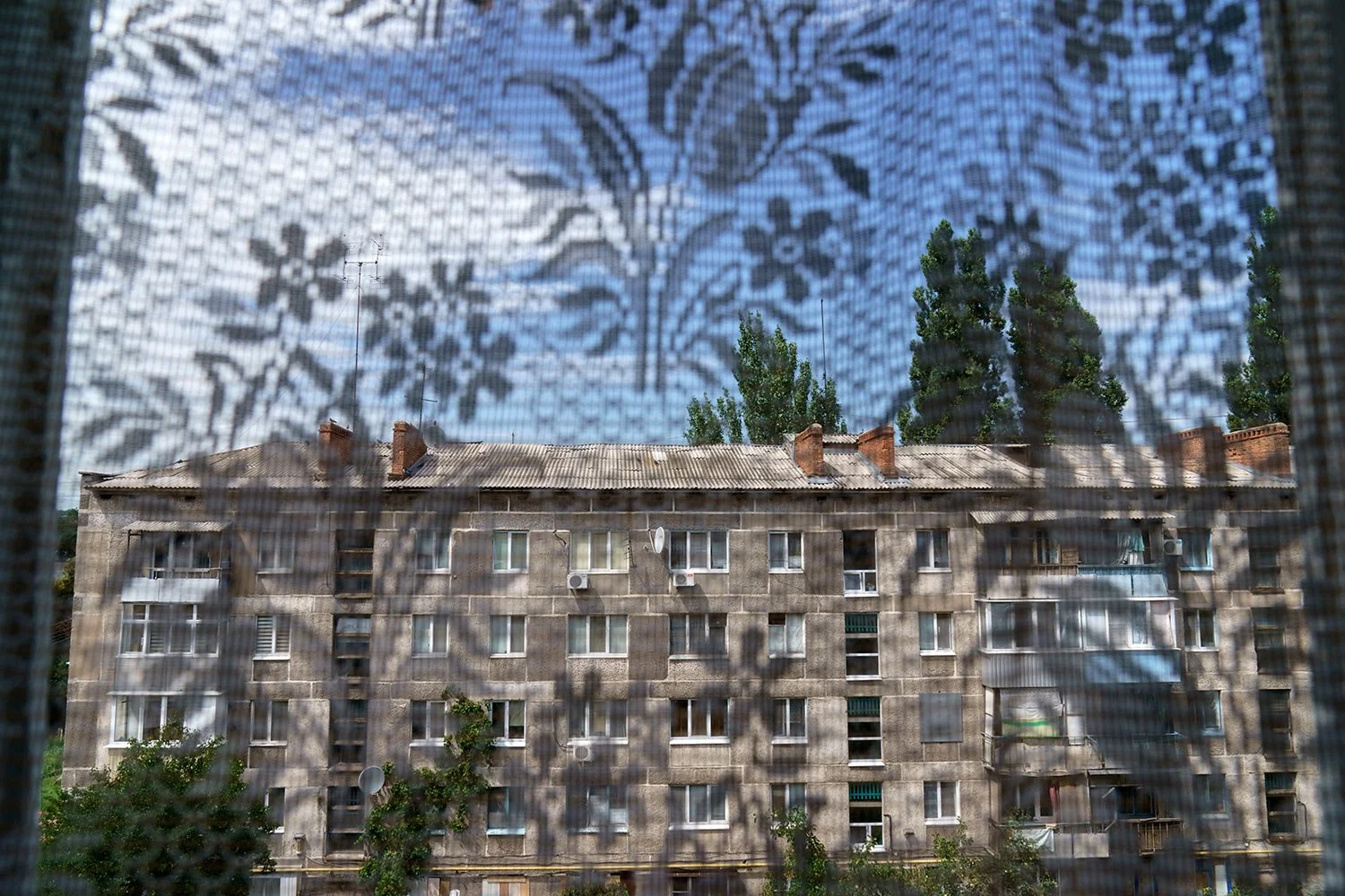 A curtain hangs in the apartment window belonging to Lyubov Mahlii, 76, in Sloviansk, Donetsk region, eastern Ukraine, Saturday, Aug. 6, 2022. (AP Photo/David Goldman)