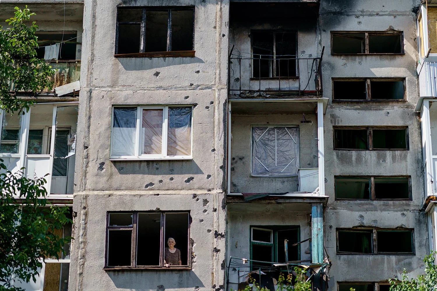 Ida Svystunova, 89, looks out the damaged room adjoining her apartment from a May rocket attack in Sloviansk, Donetsk region, eastern Ukraine, Sunday, Aug. 7, 2022. Svystunova is one of only four people left living in the block and spends most of her day looking out the window. "I sit and wait for the end of this war or maybe the end of ourselves," she said. (AP Photo/David Goldman)