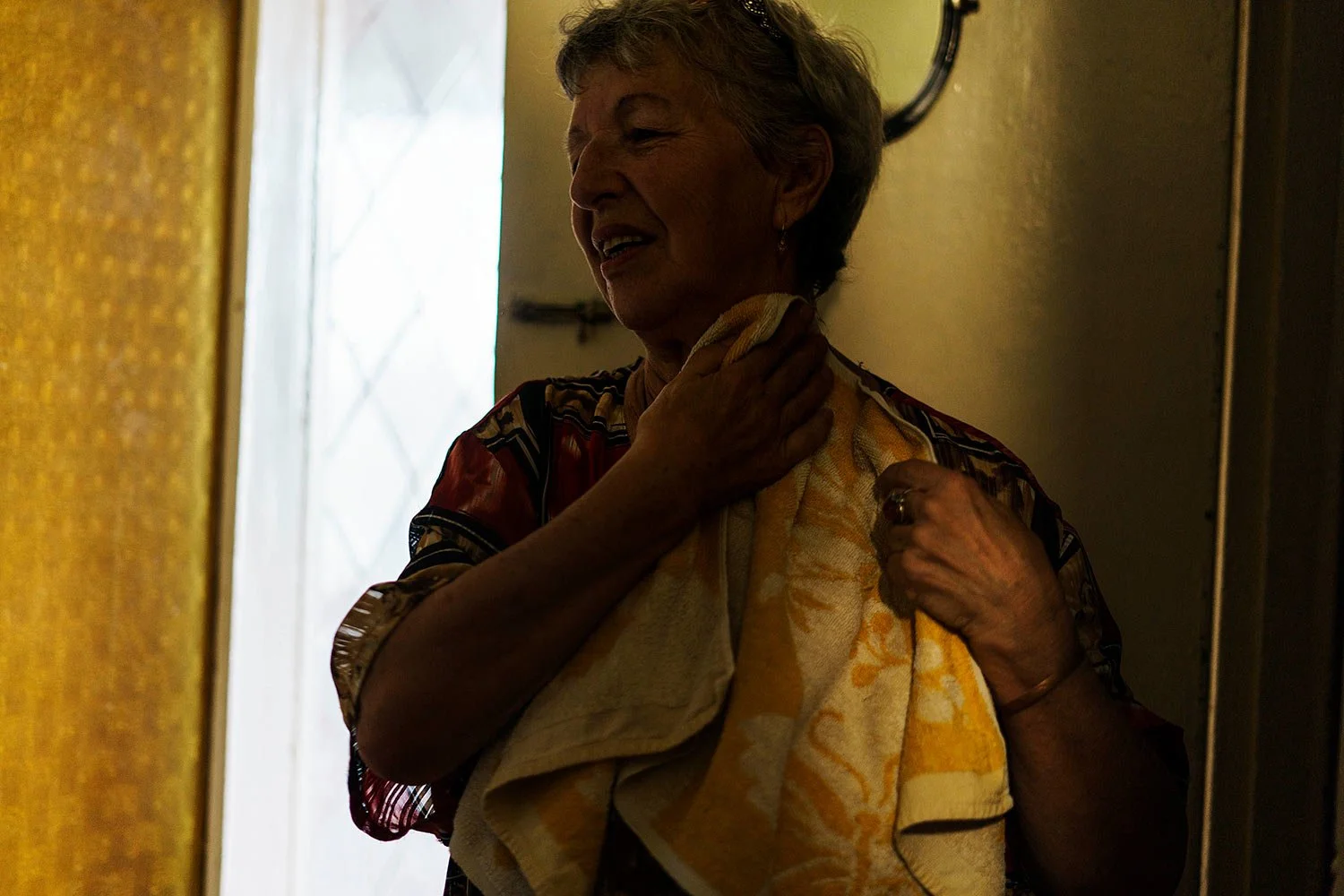 Lyubov Mahlii, 76, washes towels in her bathtub with water dragged up four flights of stairs from a public well nearby at her apartment in Sloviansk, Donetsk region, eastern Ukraine, Sunday, Aug. 7, 2022. (AP Photo/David Goldman)