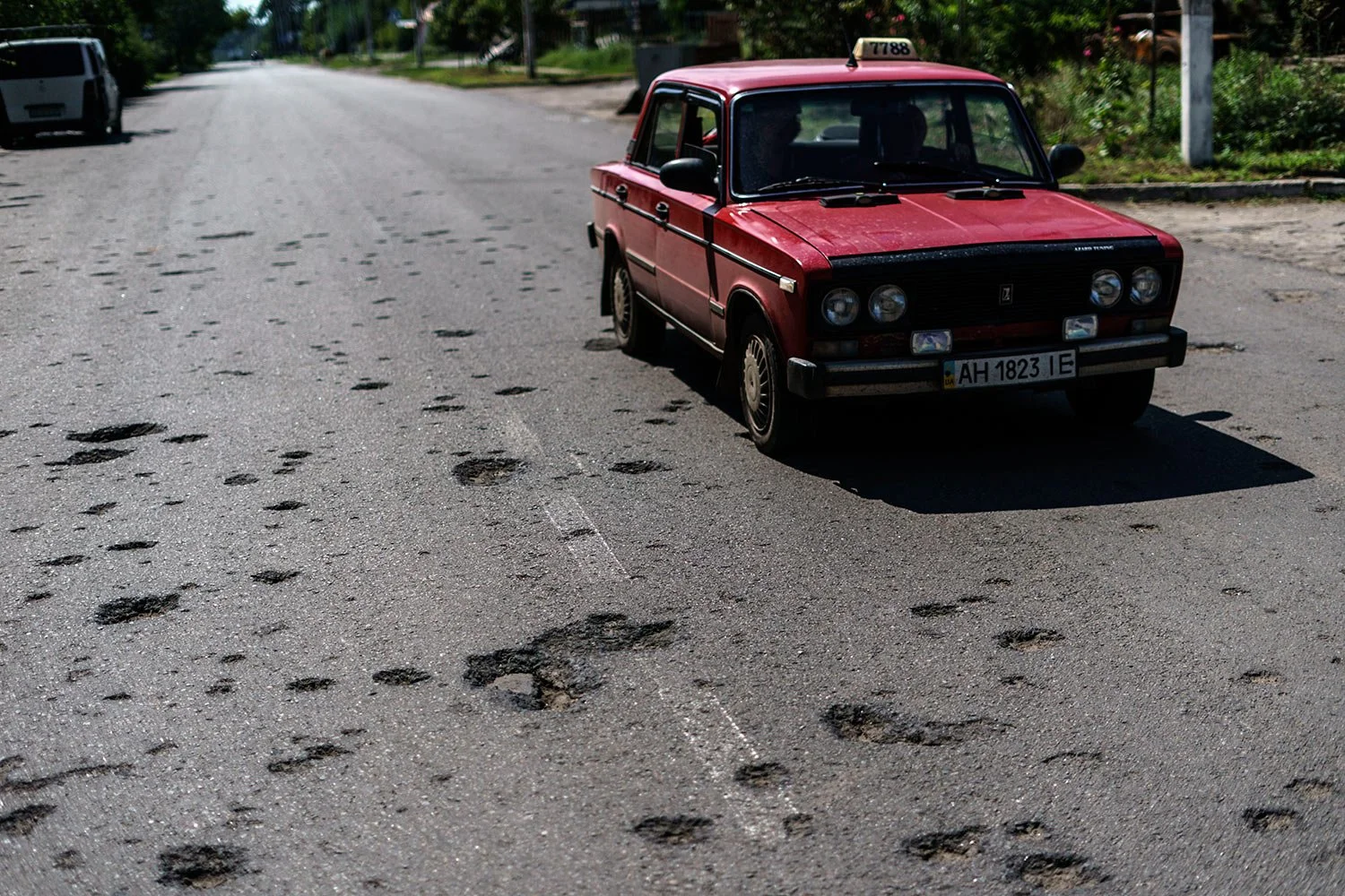 A taxi drives down a road damaged by shrapnel from a May rocket attack in Sloviansk, Donetsk region, eastern Ukraine, Saturday, Aug. 6, 2022. (AP Photo/David Goldman)