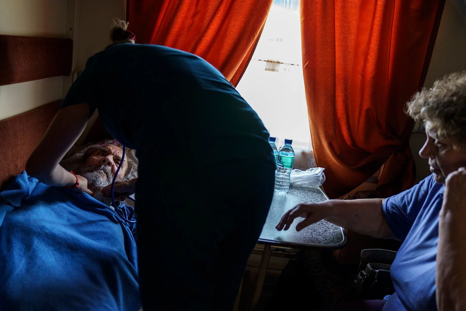 Viktor Holodeyev, 76, left, is tended to by a nurse while on an evacuation train with his wife, Tatiana, 72, as they depart from Pokrovsk, Donetsk region, eastern Ukraine, to travel west to a safer part of the country, Tuesday, Aug. 2, 2022. (AP Photo/David Goldman)