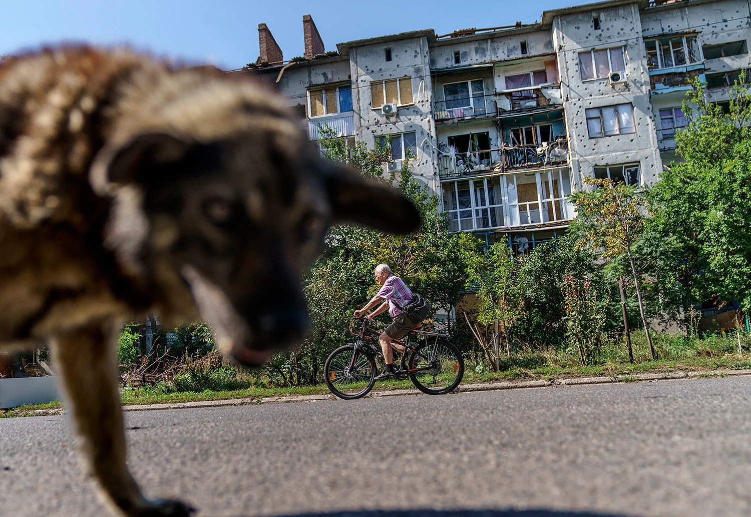 A bicyclist and a stray dog move past a damaged apartment building from a May rocket attack in Sloviansk, Donetsk region, eastern Ukraine, Saturday, Aug. 6, 2022. (AP Photo/David Goldman)