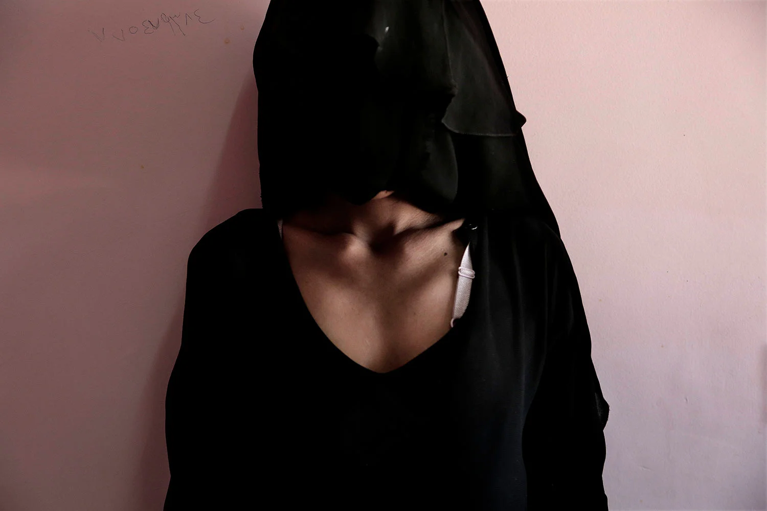 Umm Mizrah, a 25-year-old Yemeni mother, reveals her collarbones and emaciated ribs to be photographed, in this Feb. 13, 2018 photo at Al-Sadaqa Hospital in Aden, Yemen. Umm Mizrah, who is nearly into the second trimester of pregnancy, weighs 38 kilograms (84 pounds) and is severely undernourished. She has been eating one meal a day trying to feed her youngest son, who is badly malnourished. (AP Photo/Nariman El-Mofty)